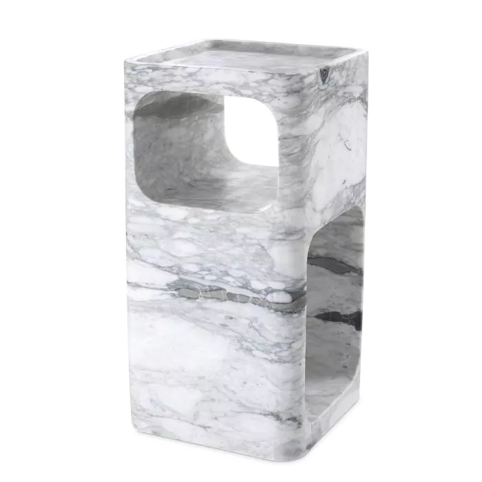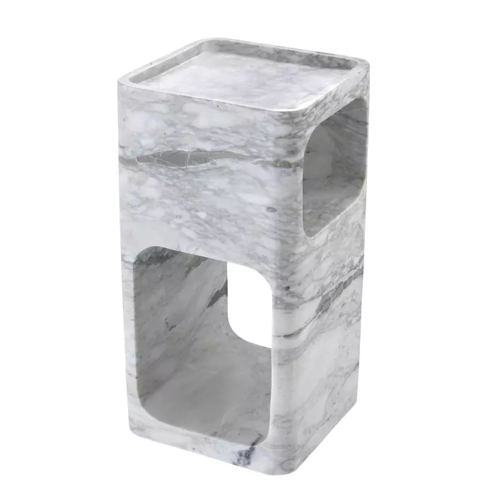 Der Beistelltisch Adler bietet großzügigen Stauraum unter der Tischplatte. Dieses Möbelstück strahlt Mid-Century Modern Style aus und besteht aus weißem Marmor, wodurch jeder Tisch einzigartig ist.