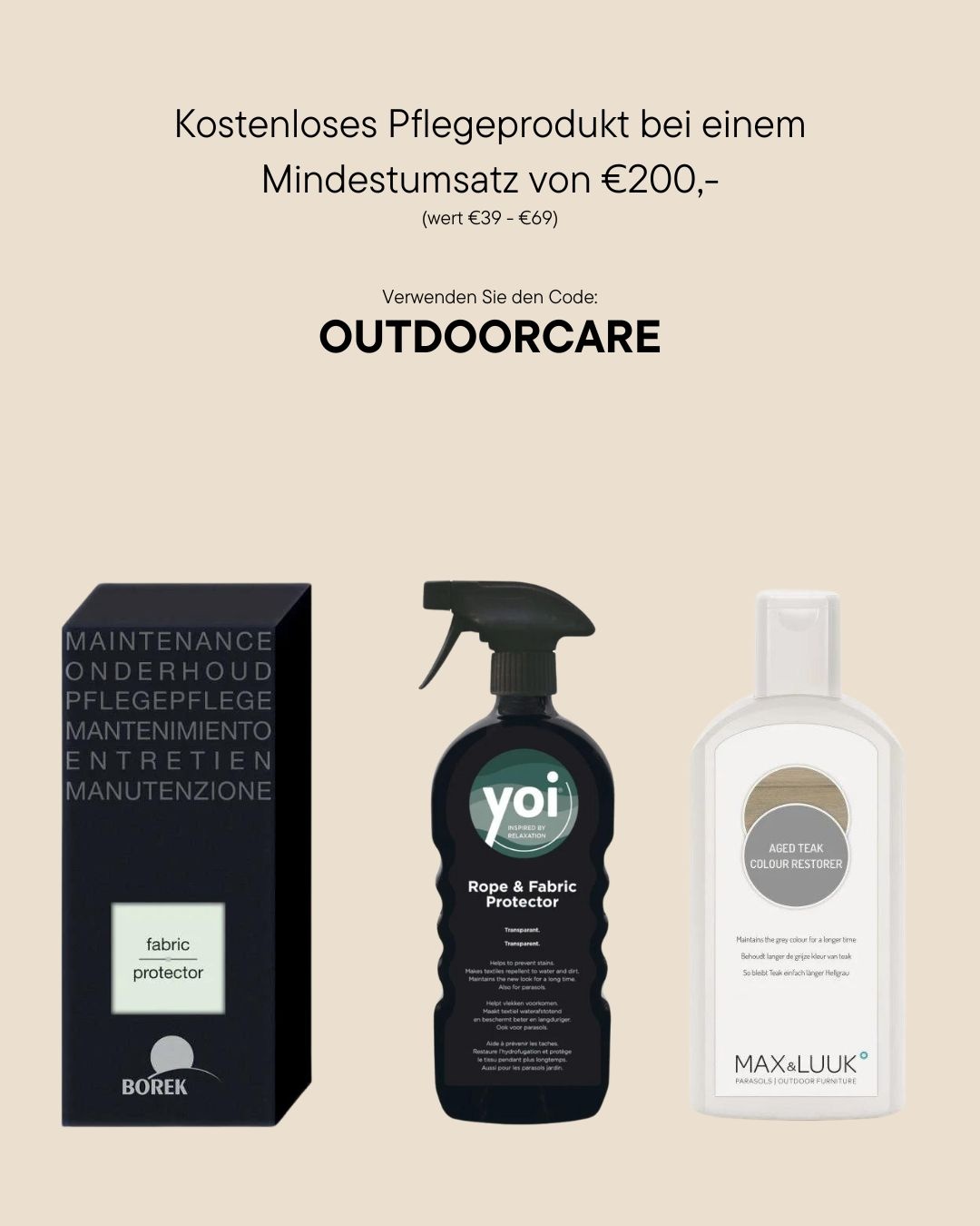 Um die Outdoor-Saison richtig zu beginnen, erhalten Sie jetzt beim Kauf von Gartenmöbeln und Zubehör einen Gratisartikel*! Bringen Sie Ihre Gartenmöbel mit den Pflegeprodukten wieder zum Glänzen oder verleihen Sie Ihrem Außenbereich einen luxuriösen Touch mit einer Outdoor-Fußmatte von RIZZ.