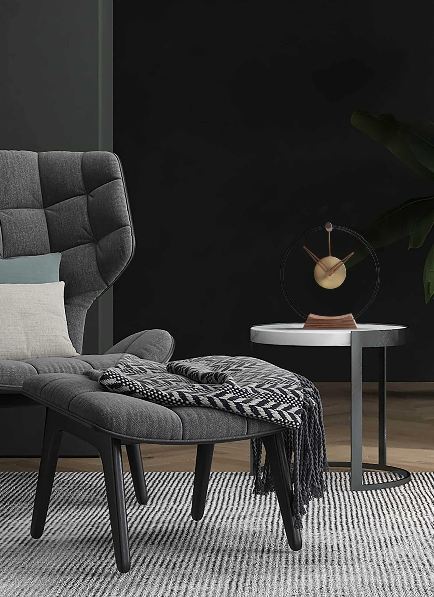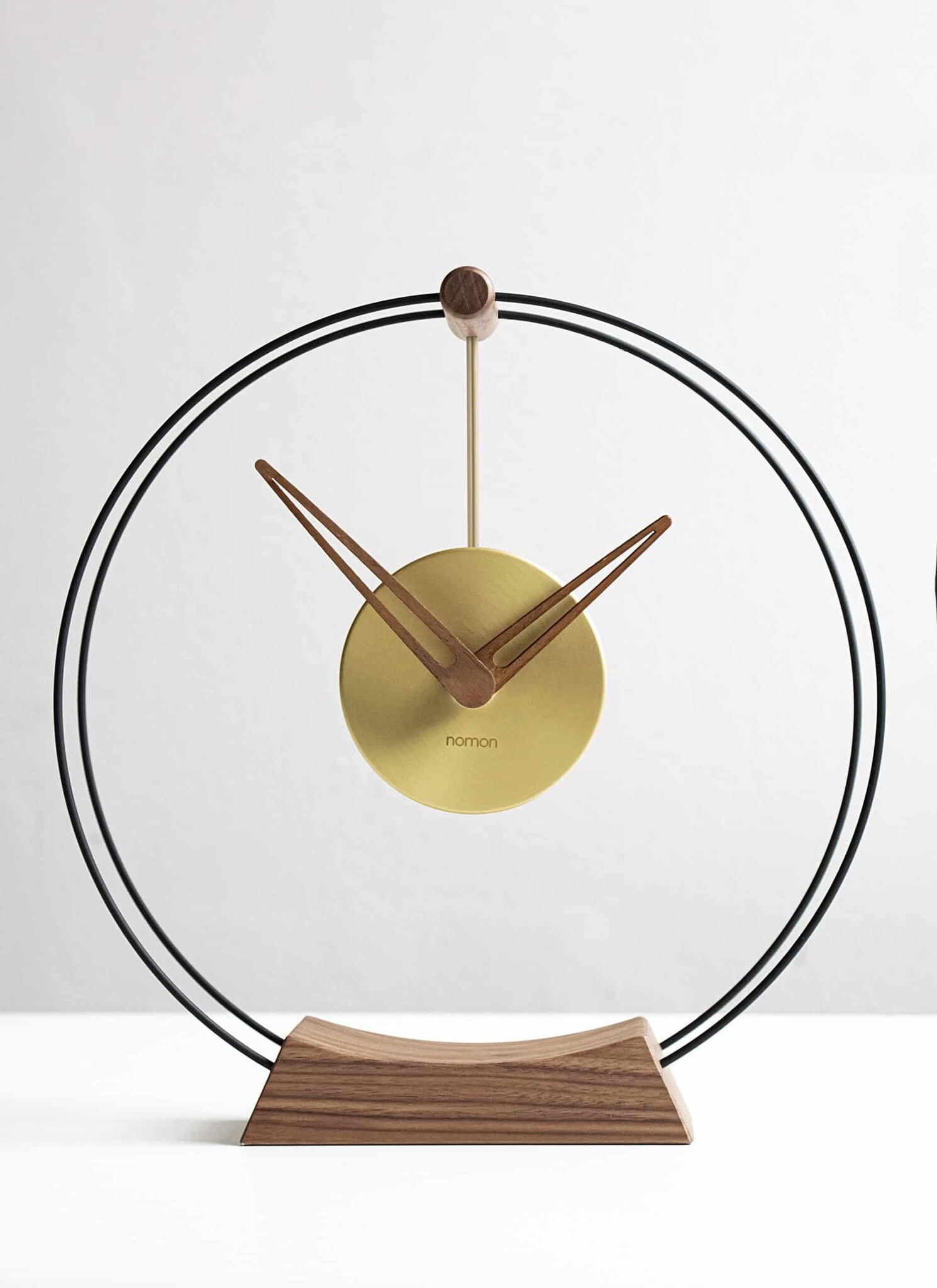 Reduzierte Version des Aire-Modells, bestehend aus einem doppelten schwarzen Fiberglasring, der Walnusselemente mit goldenen Details kombiniert.