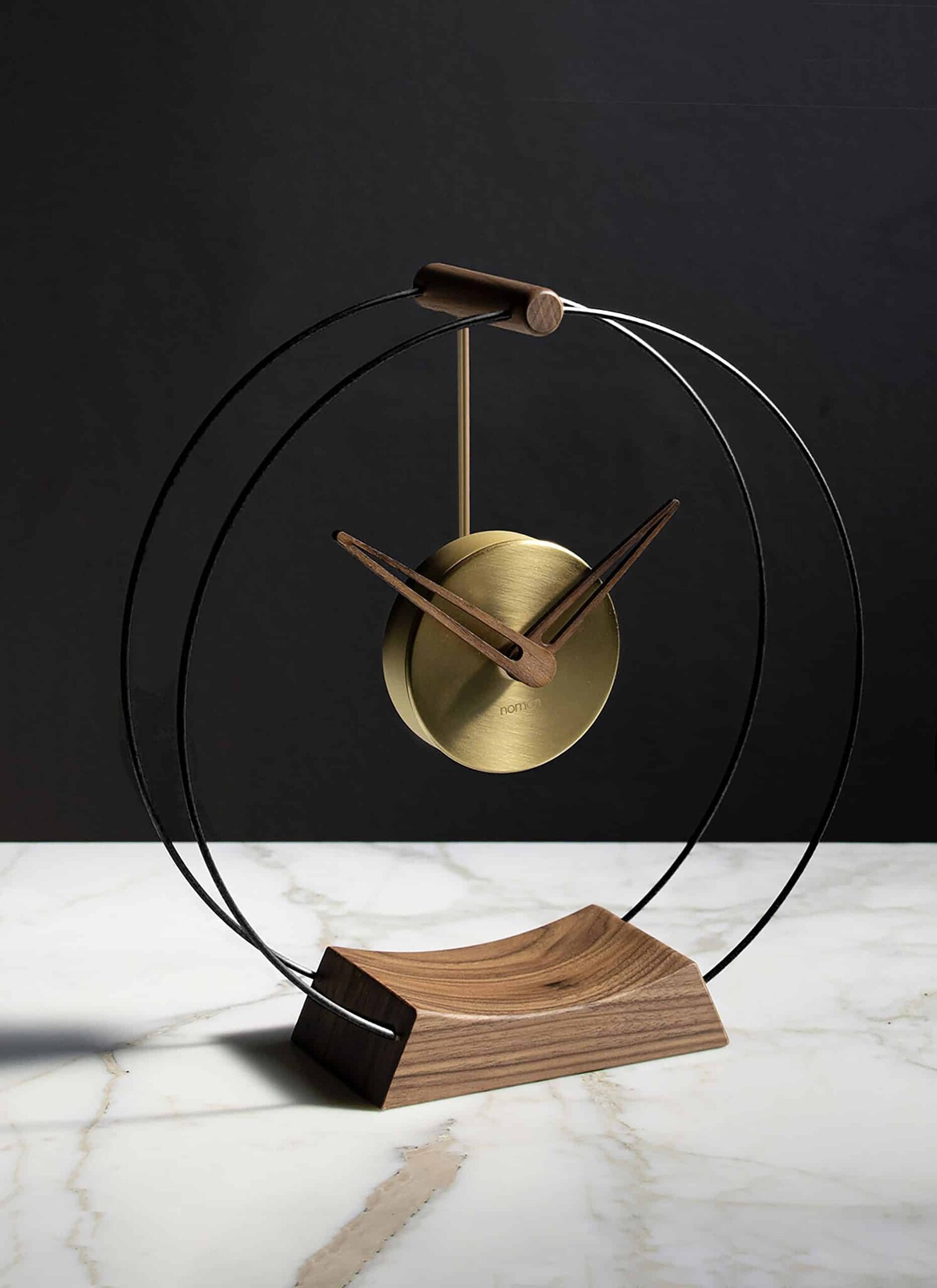 Reduzierte Version des Aire-Modells, bestehend aus einem doppelten schwarzen Fiberglasring, der Walnussstücke mit goldenen Details kombiniert.