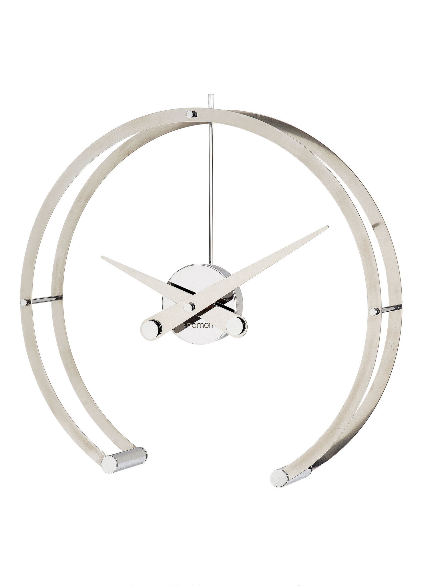 Zwei große polierte Stahlringe, die durch drei kleine Stäbe miteinander verbunden sind, ruhen auf Metallsockeln und bilden ein harmonisches Ganzes mit eigener Identität.