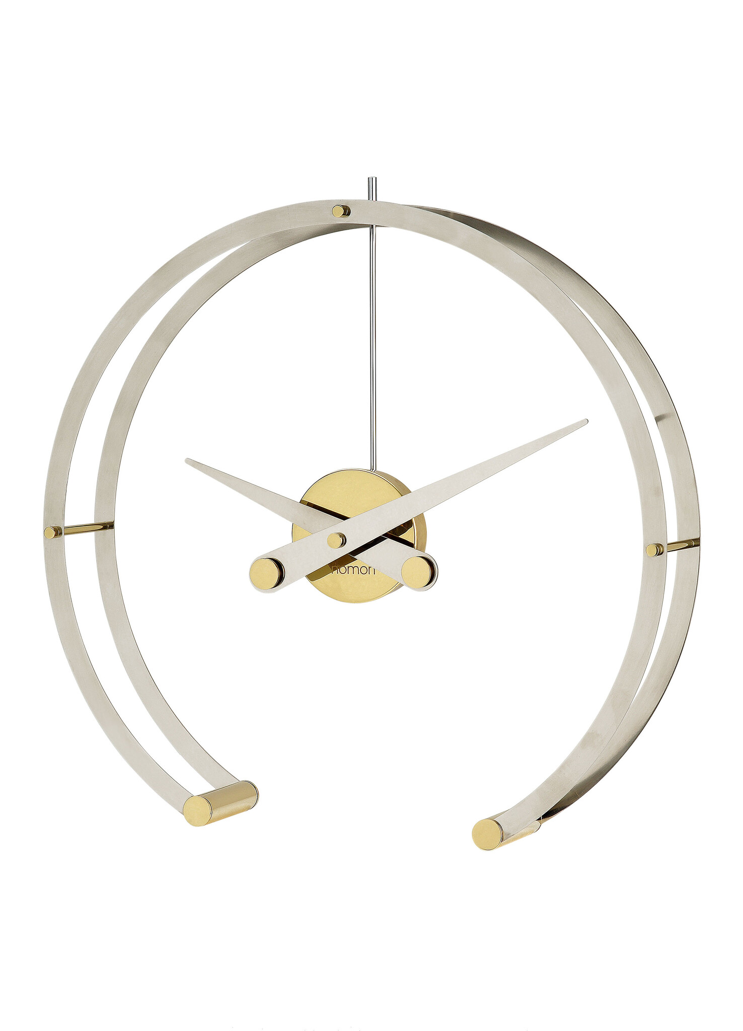 Zwei große Ringe aus poliertem Stahl, die durch drei kleine Stäbe miteinander verbunden sind, ruhen auf Metallsockeln und bilden ein harmonisches Ganzes mit eigener Identität.