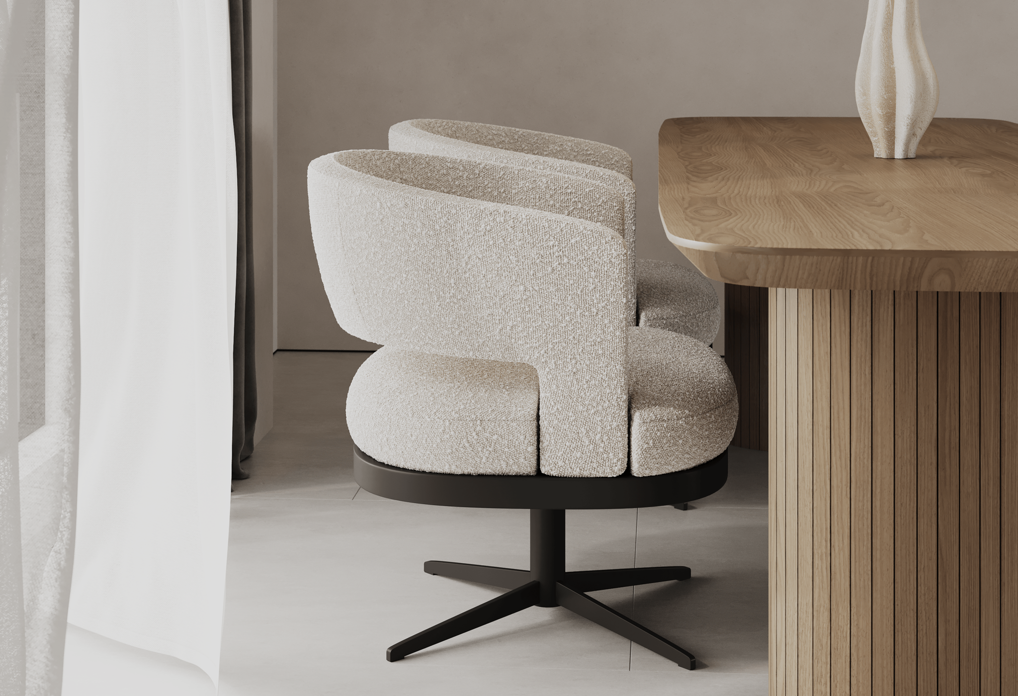 Der Esszimmerstuhl 'James' lädt zu langen Abenden mit Familie oder Freunden am Esstisch ein. Praktisch: Der Stuhl ist mit einem stabilen Drehgestell und einer offenen Rückenlehne ausgestattet. Dieser schicke Stuhl ist mit dem stilvollen Sulmona-Reliefstoff inCremeweiß gepolstert.