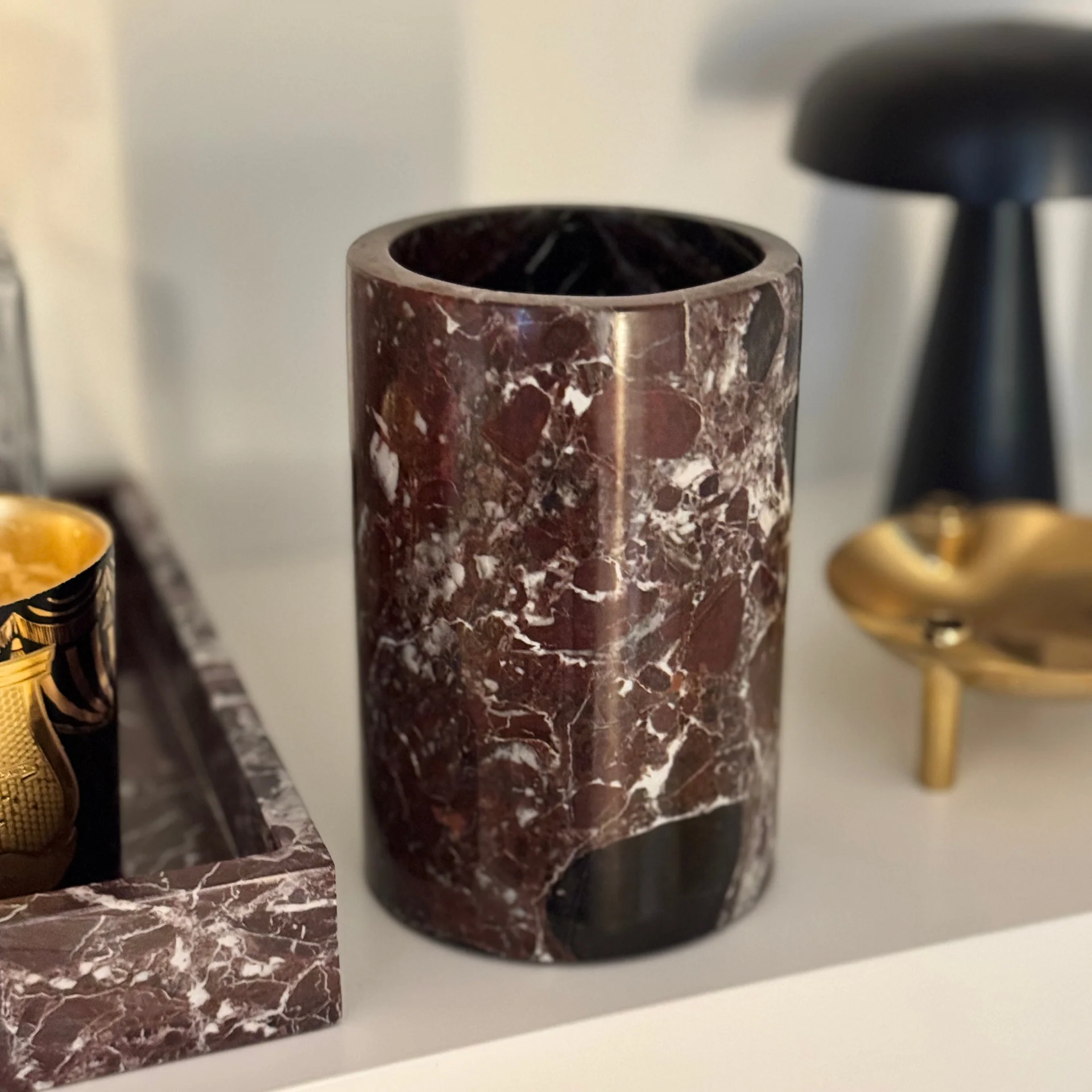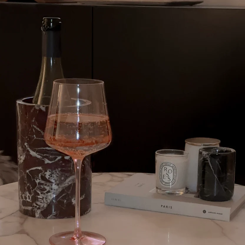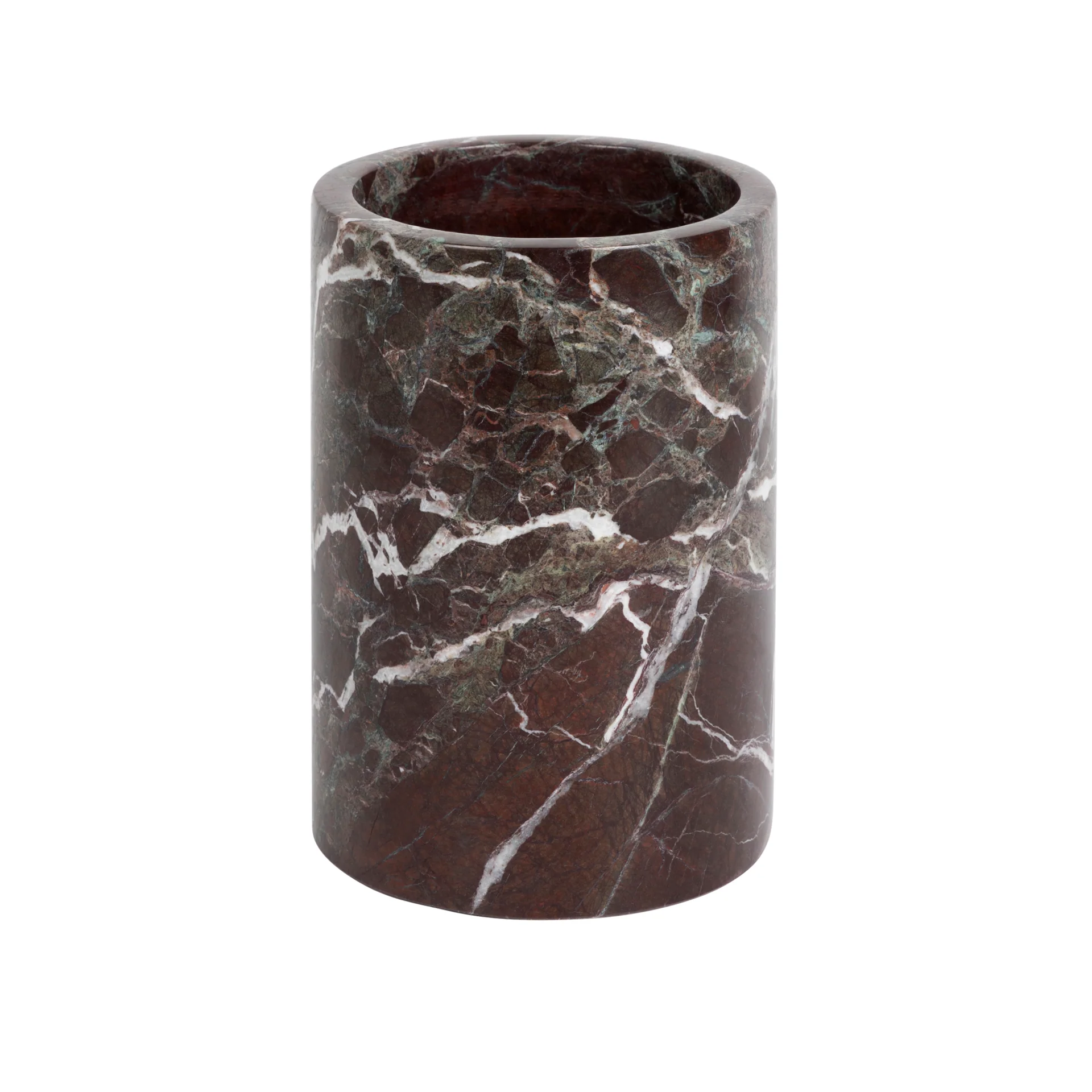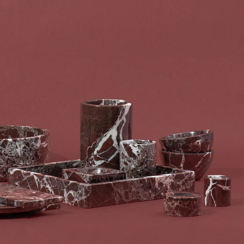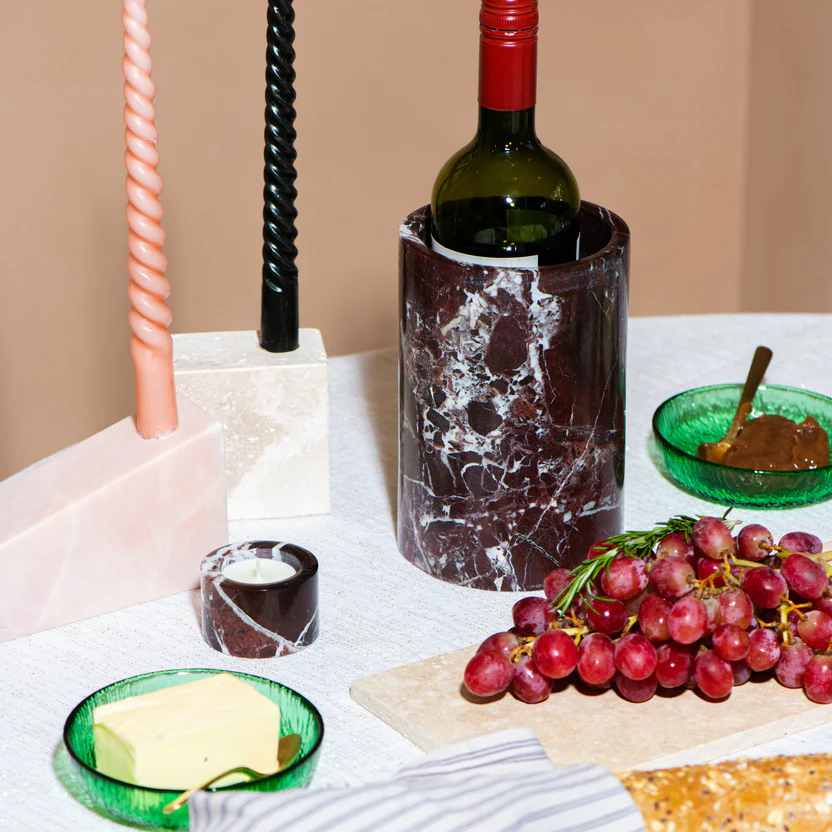 Hergestellt aus natürlichem burgunderrotem Marmor, ist jeder Kühler ein Unikat mit tiefroten Farbtönen und einem wunderschönen Muster aus weißen Adern. Die Hochglanzoberfläche verstärkt die satten Farbtöne des Marmors und sorgt so für einen auffälligen, luxuriösen Look.
