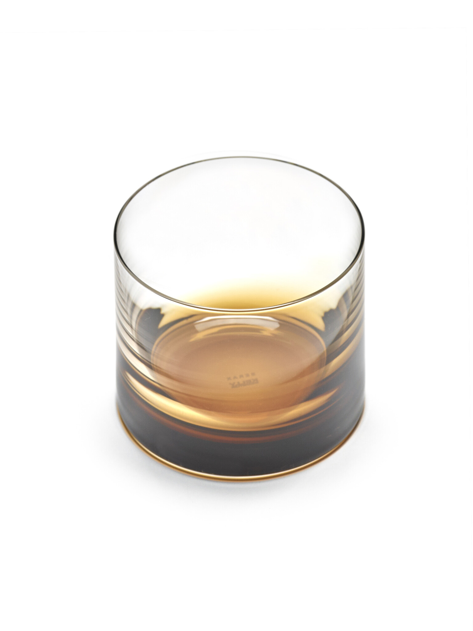 Neben Porzellangeschirr kreierte Kelly Wearstler auch Glaswaren in Bernsteintönen, die bei antiken und Vintage-Glaswaren auf der ganzen Welt so weit verbreitet sind. Der einzigartige Farbverlaufseffekt wird durch die Verwendung von drei Glasschichten erzielt: Die bernsteinfarbene Masse wird zwischen zwei Schichten aus transparentem Glas eingespritzt. Die luftige, luftige Farbe steht in schönem Kontrast zu dem markanten, dicken Glasboden und der schlichten, geraden Form dieser Bechergläser. Die Gläser sind pro 4 in einer luxuriösen Giftbox verpackt.