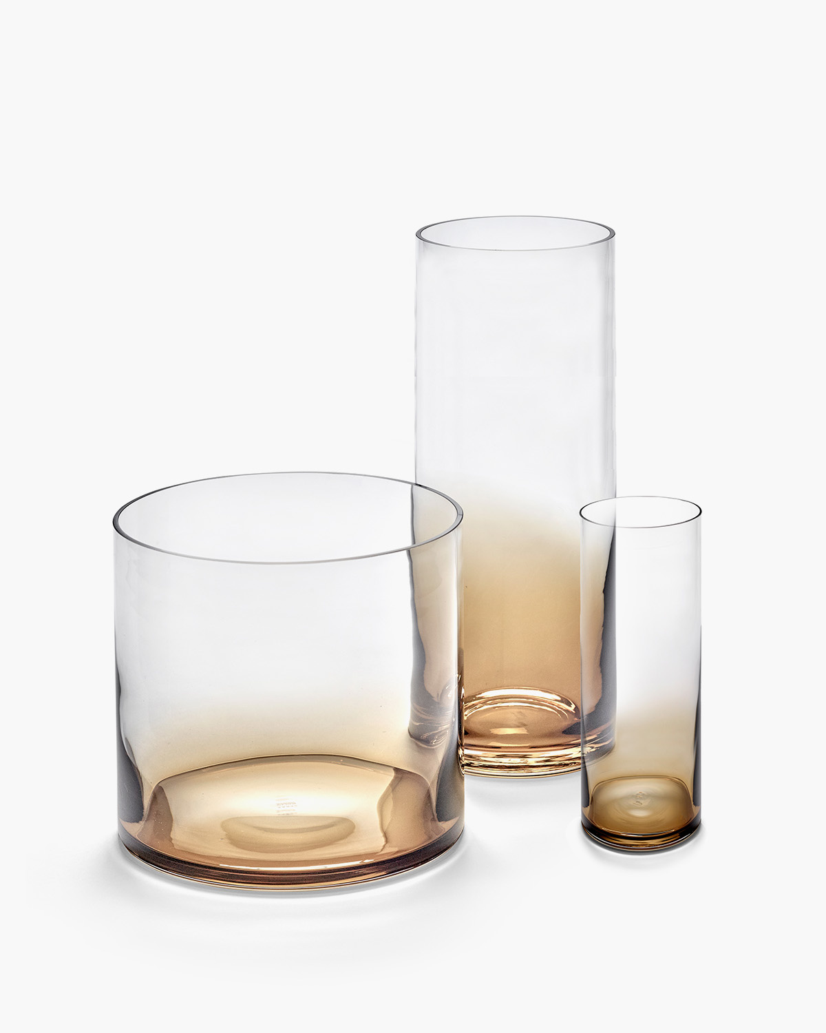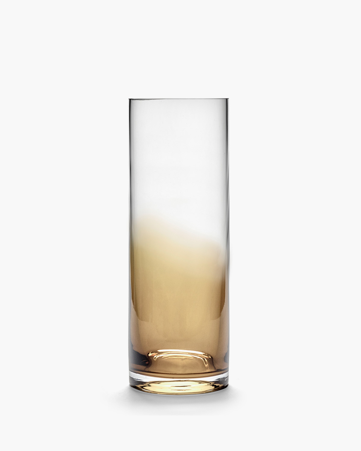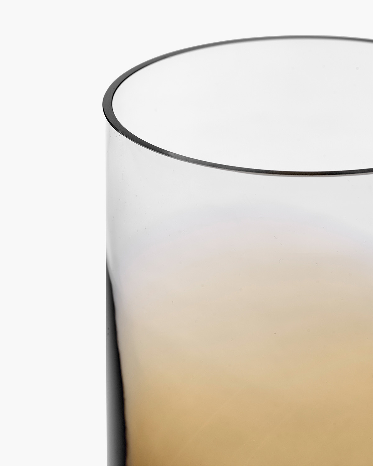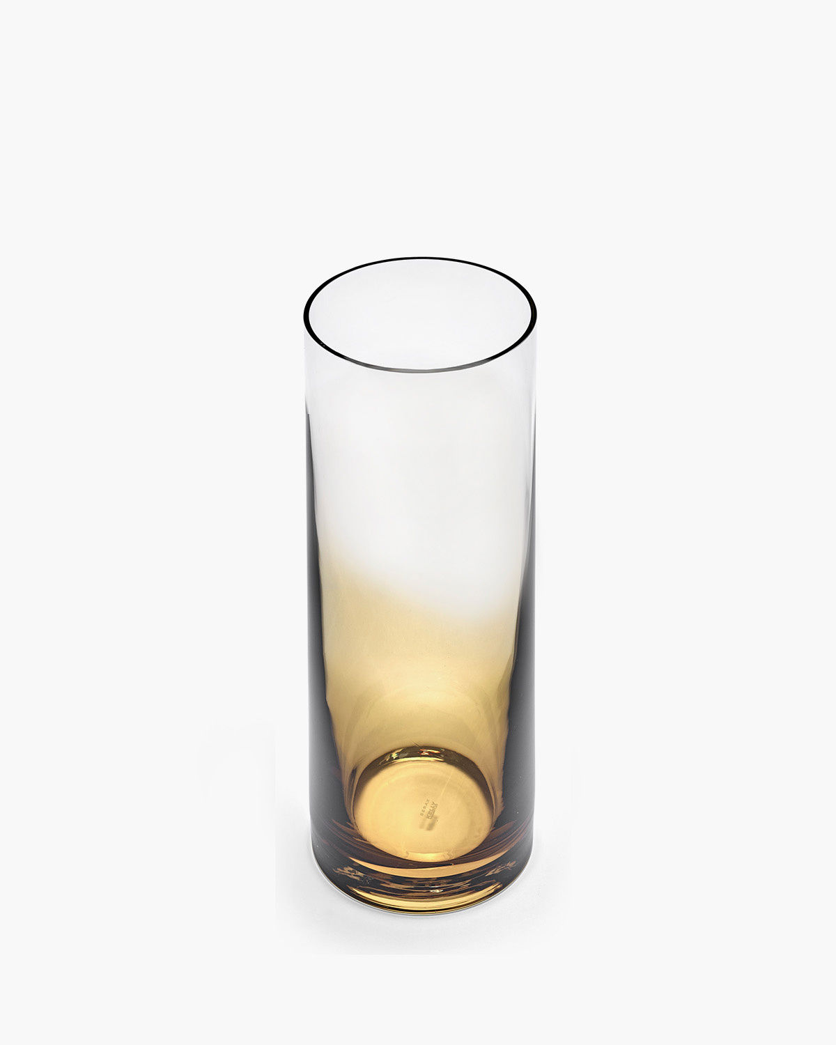 Neben Porzellangeschirr kreierte Kelly Wearstler auch Glaswaren in Bernsteintönen, die bei antiken und Vintage-Glaswaren auf der ganzen Welt so weit verbreitet sind. Der einzigartige Farbverlaufseffekt wird durch die Verwendung von drei Glasschichten erzielt: Die bernsteinfarbene Masse wird zwischen zwei Schichten aus transparentem Glas eingespritzt. Die luftige, luftige Farbe steht in schönem Kontrast zu dem markanten, dicken Glasboden und der schlichten, geraden Form dieser Bechergläser. Die Vase ist in einer luxuriösen Giftbox verpackt.