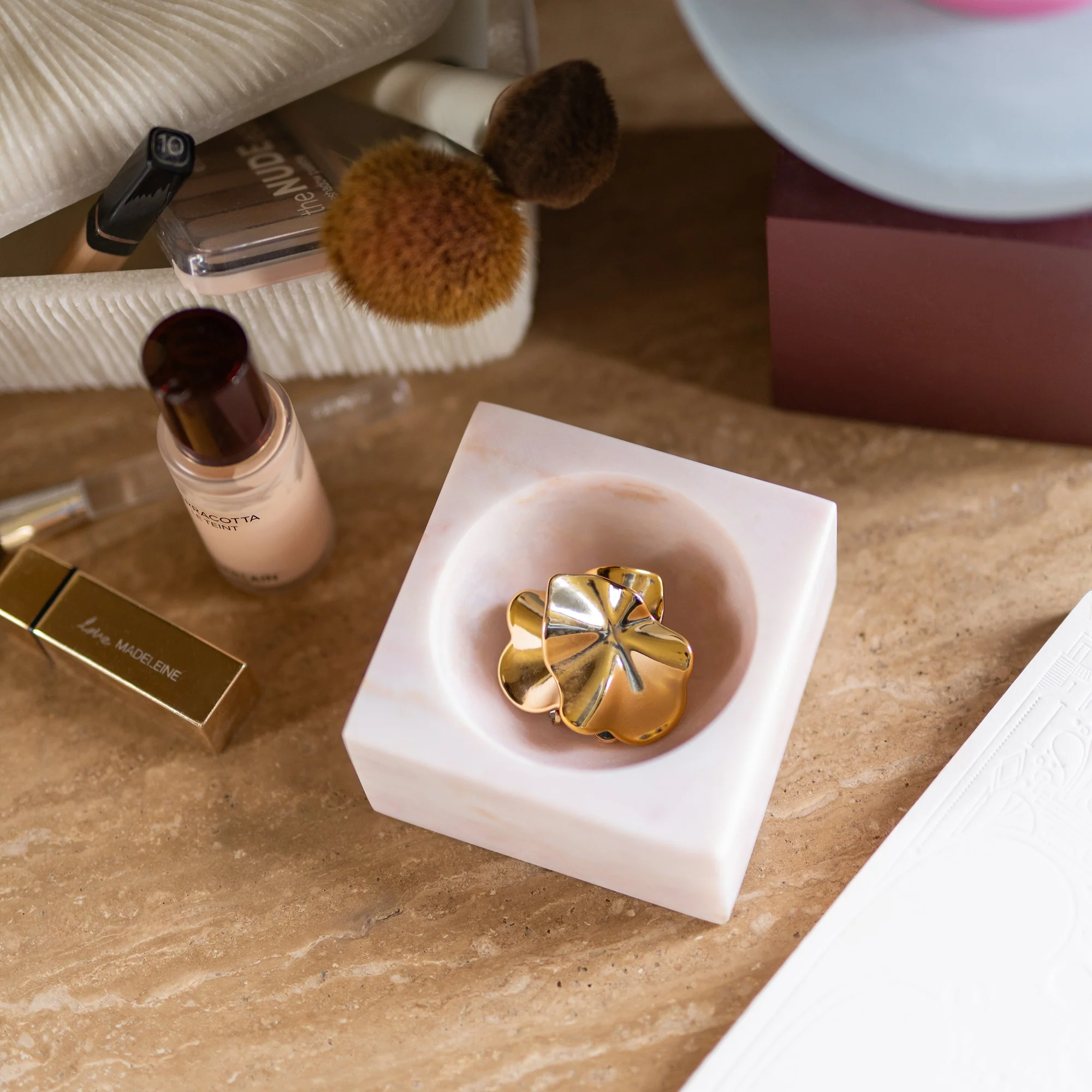 Unsere Pink Marble Block Bowl verbindet mühelos Luxus und Funktionalität. Sie ist die perfekte Schlüsselschale für Ihren Flurschrank oder eine elegante Lösung zur Aufbewahrung Ihres Schmucks und Ihrer Kleinigkeiten auf Ihrem Schminktisch.