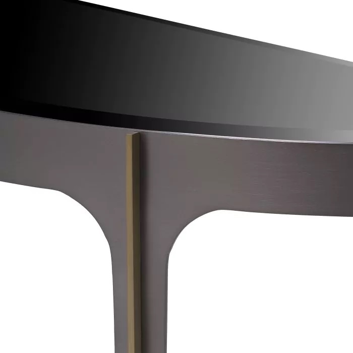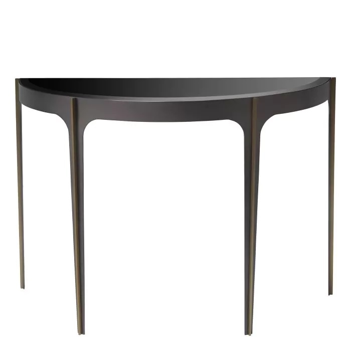 Der Konsolentisch Artemisa im Mid-Century-Modern-Design setzt mit seinem eleganten Gestell in Bronzeoptik ein Zeichen. Die inneren Kurven des Rahmens werden durch schlichte, gebürstete Messingstangen an den Beinen und eine halbkreisförmige Tischplatte aus abgeschrägtem schwarzem Glas akzentuiert, die die Geräumigkeit der soliden Materialien, aus denen dieses Möbelstück besteht, in den Mittelpunkt stellt.