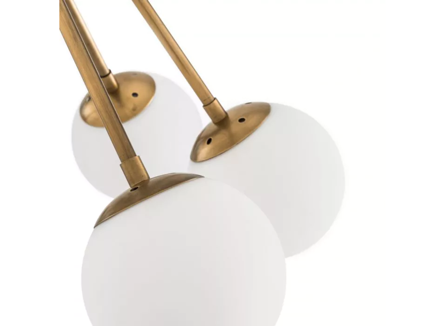 Der funky Kronleuchter Luxor bringt einen Hauch von Mid-Century Modern-Flair in Ihr Möbelarrangement. Diese Metallarmatur mit antikem Messingfinish hat 8 Arme, die sich von einem kugelförmigen Zentrum aus erstrecken. Die weißen Glaskugeln verstärken den Retro-Look dieses Designs.