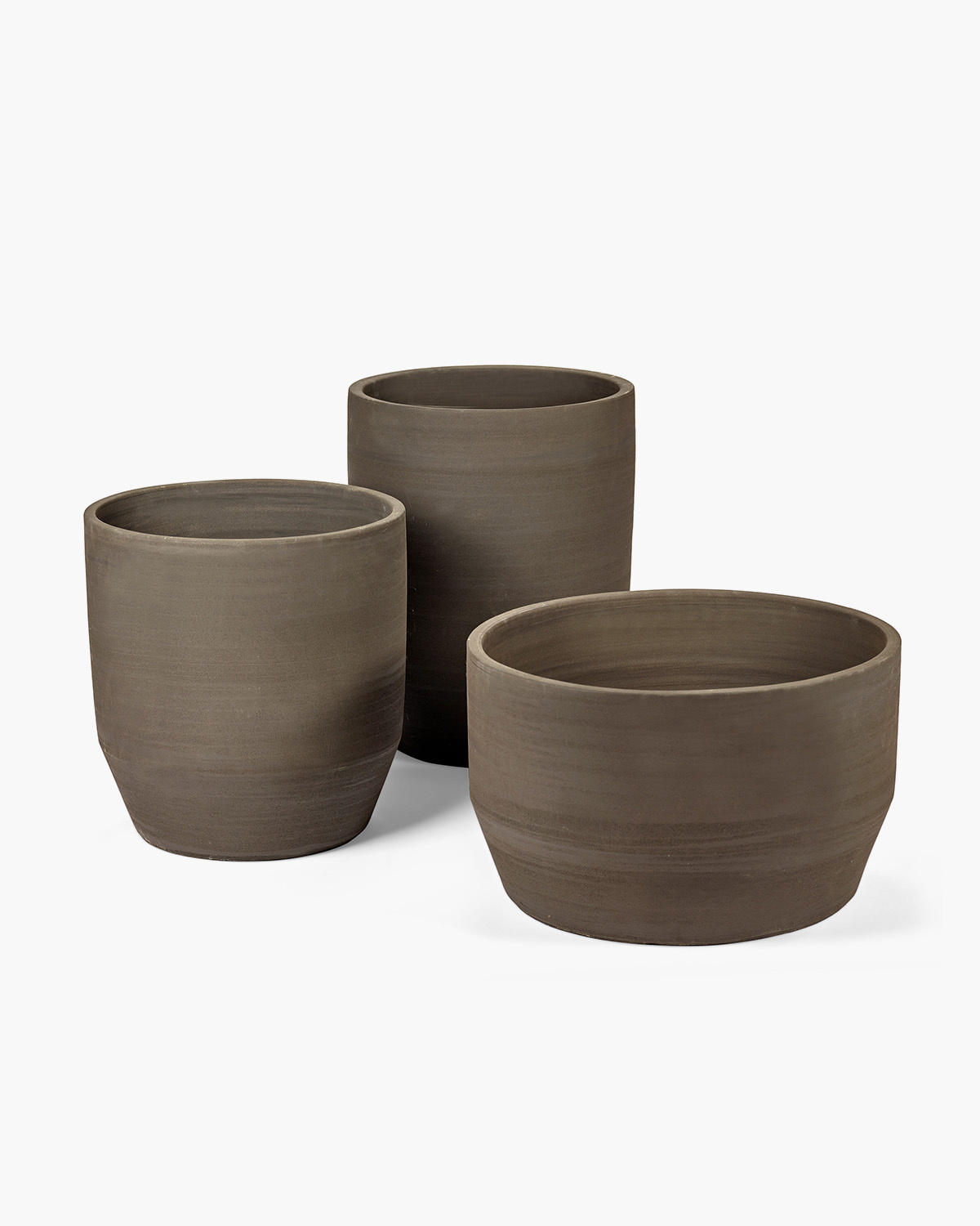 Diese Pflanzgefäße aus Steingut von Marie Michielssen sind Teil der Kollektion Construct. Mit ihren einfachen, reinen Formen und Proportionen, die von der Architektur inspiriert sind, bieten sie eine zeitgenössische Interpretation alter Formen. Ihr modernes, erdiges und primitives Aussehen macht sie zu idealen Dekorationsobjekten. Bei Verwendung im Innenbereich nicht direkt in den Topf pflanzen. Für die Verwendung im Freien muss ein Entwässerungsloch gebohrt werden.