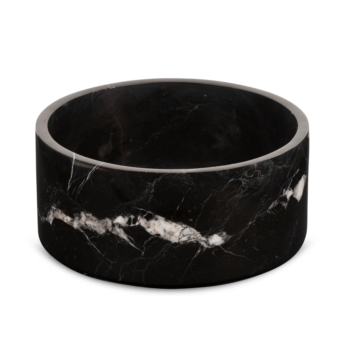 Die Hochglanzoberfläche unterstreicht das tiefe Schwarz des Steins, während die natürlichen weißen Adern, mit gelegentlichen braunen und grauen Akzenten, jedem Stück einen einzigartigen Charakter verleihen. Ob als Blickfang oder als funktionales Highlight – diese Obstschale aus schwarzem Marmor verleiht Ihrem Interieur sofort einen Hauch von Eleganz.