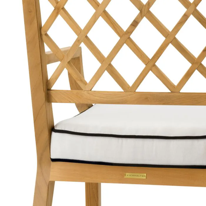 Verleihen Sie Ihrem Außenbereich mit dem Paladium Dining Chair, der sich durch ein edles Gestell aus natürlichem Teakholz und ein elegantes Sunbrella-Polster aus Stoff auszeichnet, einen Hauch von Raffinesse. Die nahtlose Verbindung von natürlichen Holztönen und wetterbeständigem Stoff, ergänzt durch ein weiches Sitzkissen, bietet anspruchsvollen Kennern eines raffinierten Lebens im Freien dauerhaften Komfort und zeitlose Eleganz.