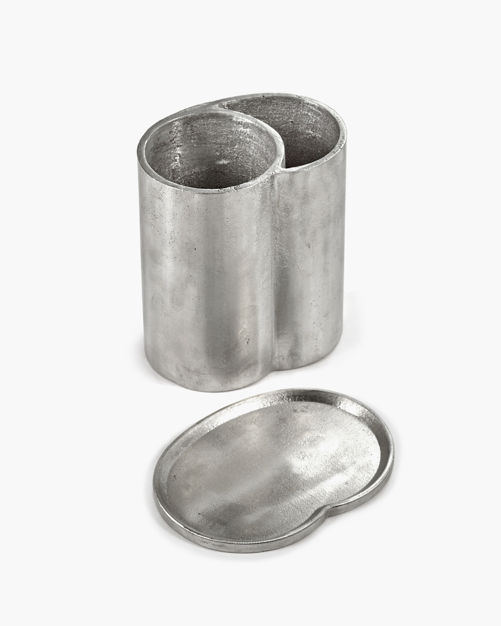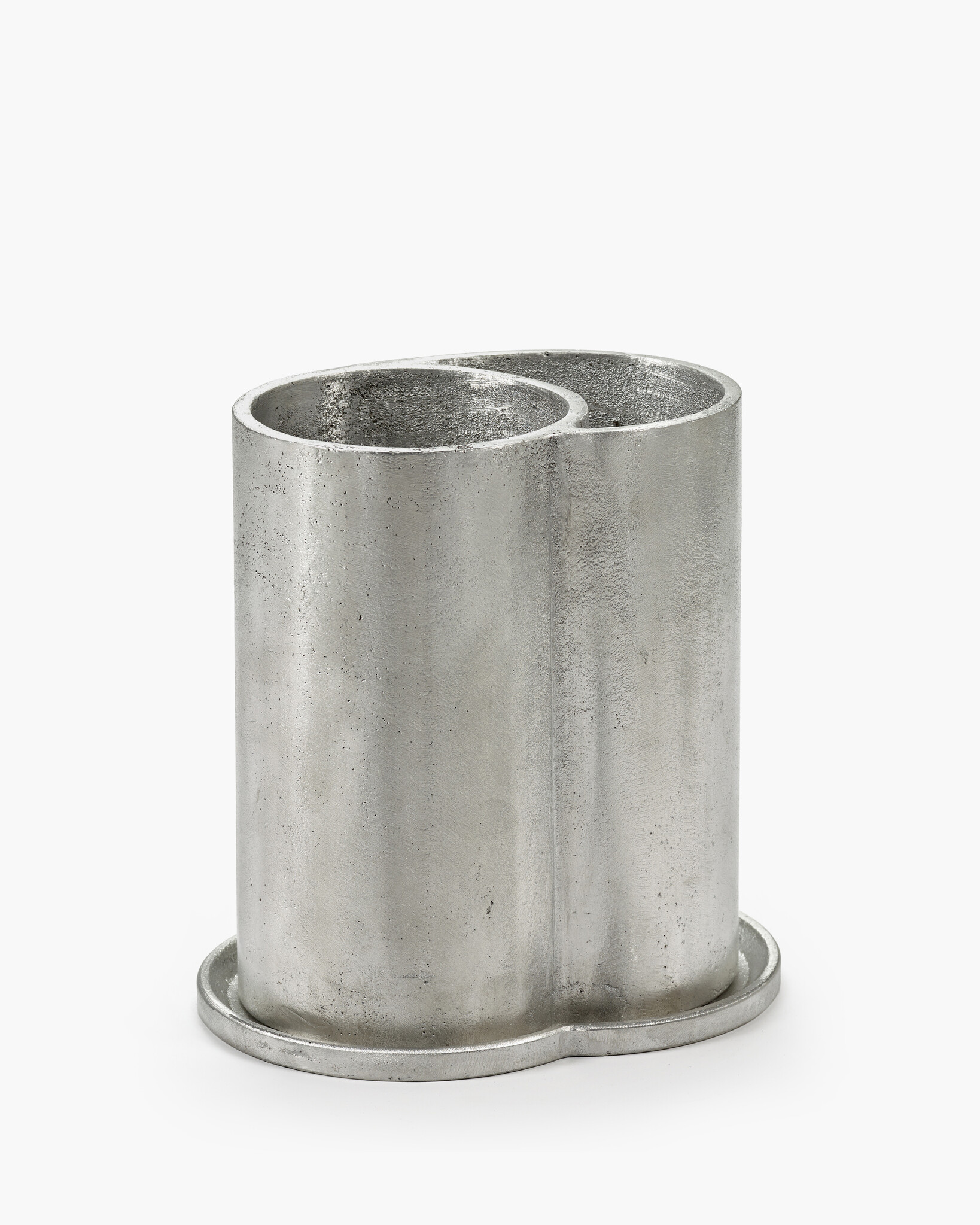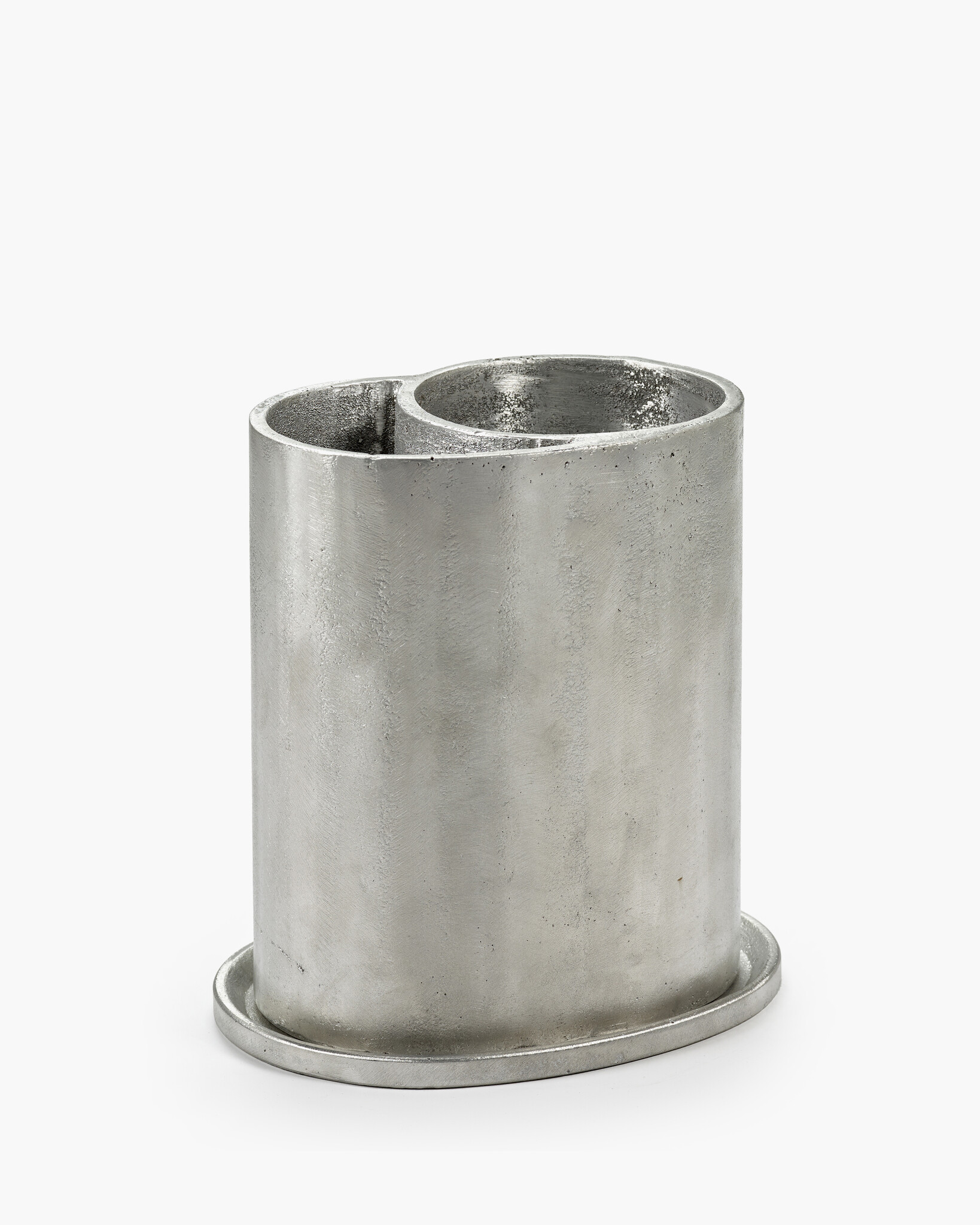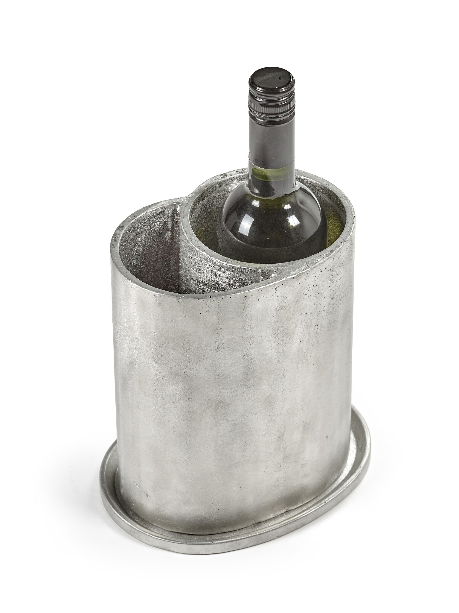 Der Spitzenkoch Sergio Herman ist in allem, was er tut, ein Perfektionist. Wenn er einen Weinkühler für seine Geschirrserie Surface entwirft, zählt jedes Detail. Natürlich muss er den Zweck erfüllen, für den er gemacht ist: den Wein so lange wie möglich kühl zu halten. Deshalb hat sich Herman für Aluminium entschieden, ein Metall, das sich perfekt für den Gefrierschrank eignet und lange kalt bleibt. Der Kühler hat zwei Fächer: eines für die Flasche und eines für zusätzliches Eis. Und er hat eine Schale, die das Kondenswasser aus dem Kühler auffängt und dafür sorgt, dass die Tischplatte trocken bleibt. Auch die Verarbeitung ist etwas Besonderes. Die unregelmäßige Oberfläche des Aluminiumgusses lädt zum Anfassen ein. Sie spiegelt die handwerkliche Herstellung dieses Weinkühlers wider.