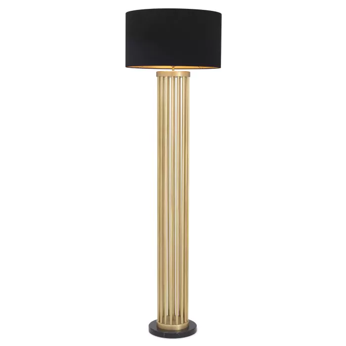 Aktualisieren Sie Ihr Zuhause mit Floor Lamp Condo. Auf einem schwarzen Marmorsockel sitzend, strahlt diese moderne Stehlampe einen dezenten Charme aus. Seine luftige zylindrische Basis besteht aus Metallstäben mit antikem Messing-Finish. Die Leuchte wird komplett mit einem runden schwarzen Trommelschirm mit goldfarbener Innenseite für extra warmes Licht geliefert.