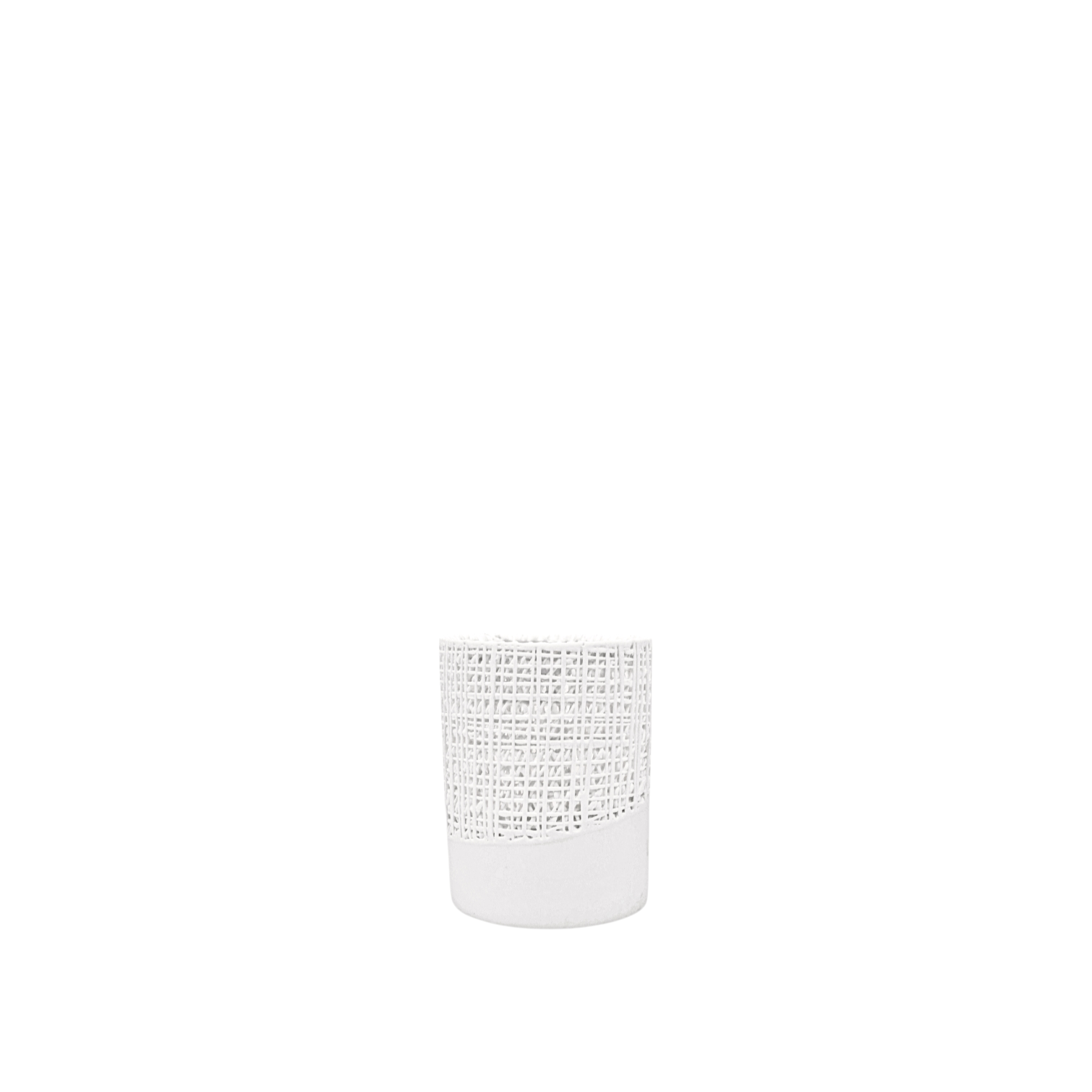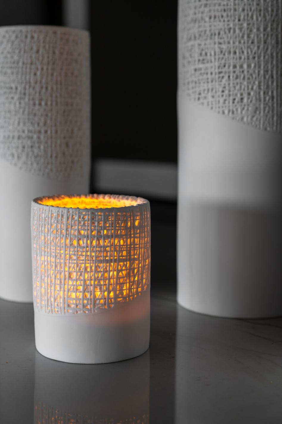 Der Manel-Teelichthalter hat eine glatte Oberfläche, die vom Boden ausgeht und in ein zart gewebtes Netz aus einfachen, klaren Linien übergeht. Das Kerzenlicht scheint wunderschön durch das gewebte Netz aus feinem Bone China. Jeder Teelichthalter wird von erfahrenen Handwerkern von Hand gefertigt.