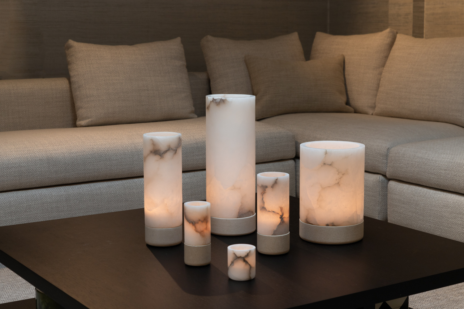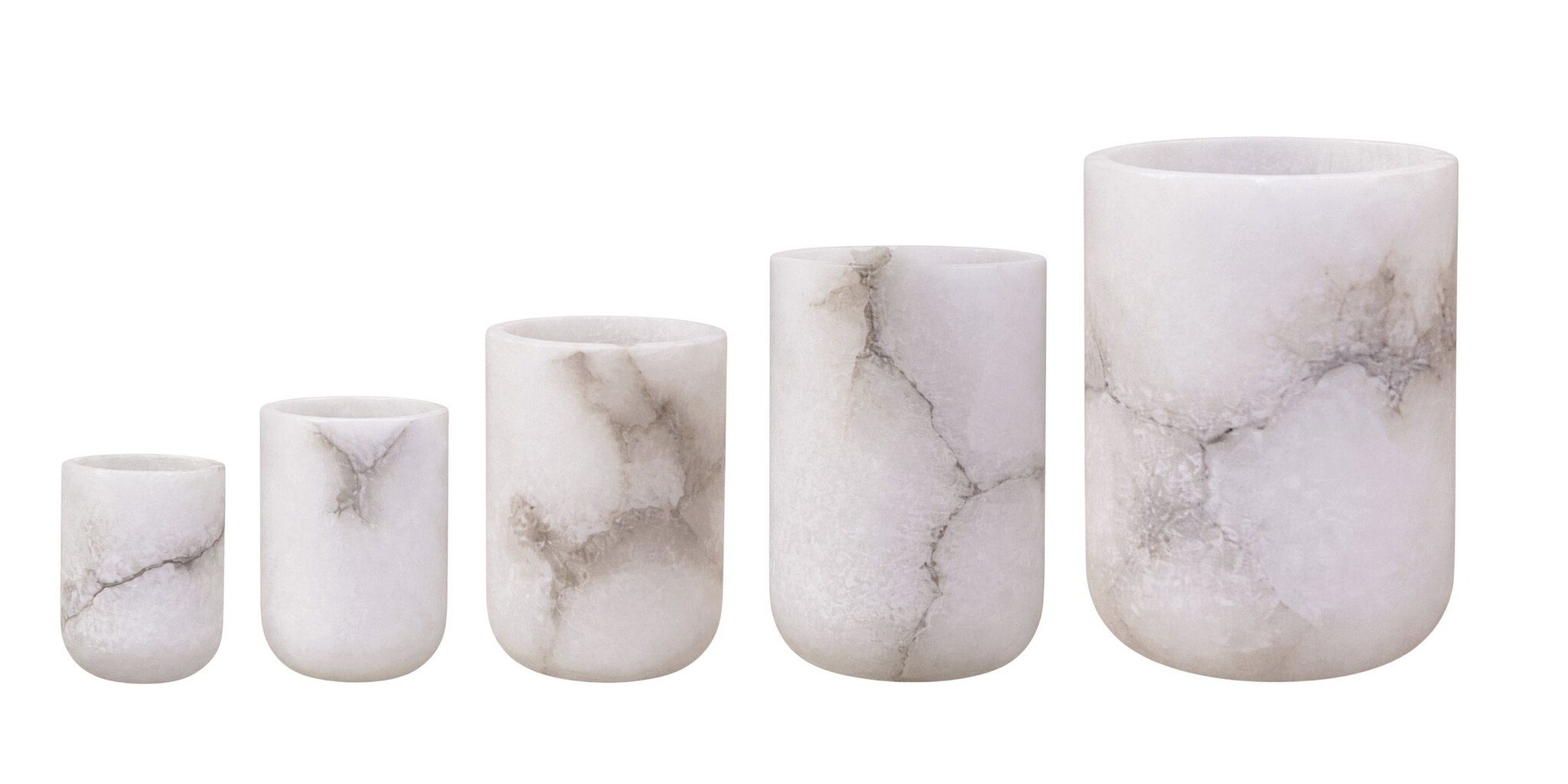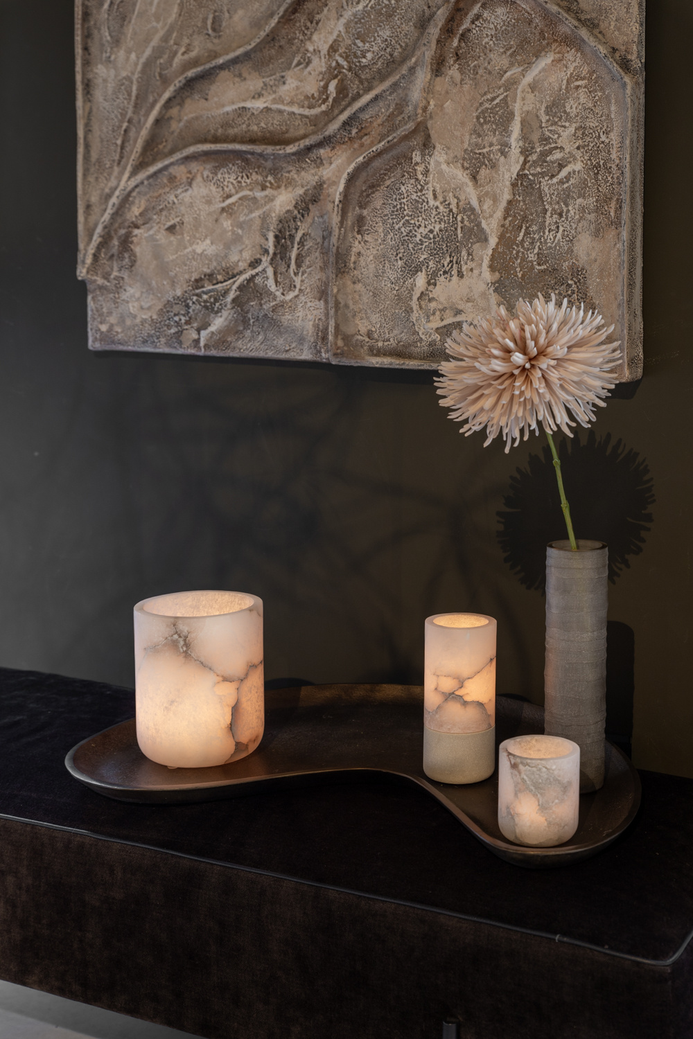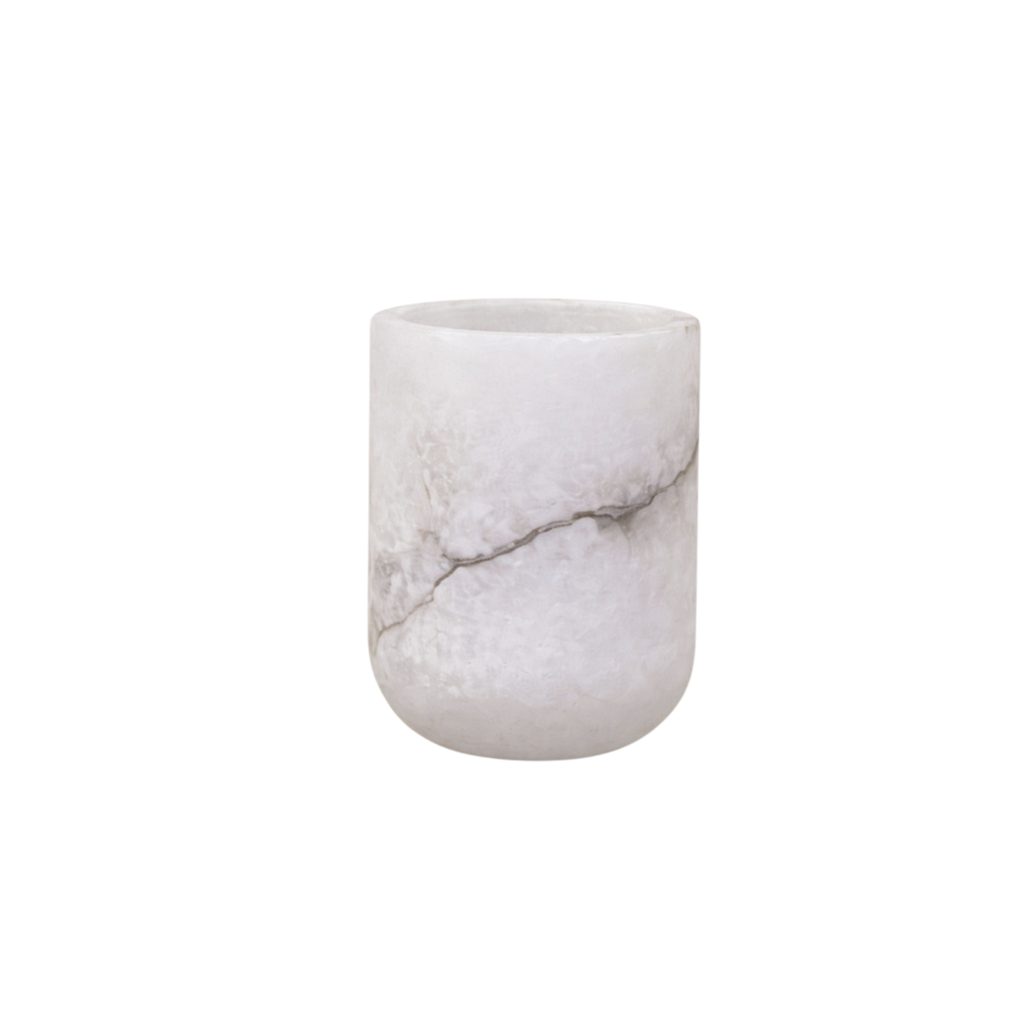 Ein schöner Teelichthalter aus mattem Alabaster, der die Olvar-Kollektion von Alabaster-Windlichtern ergänzt.