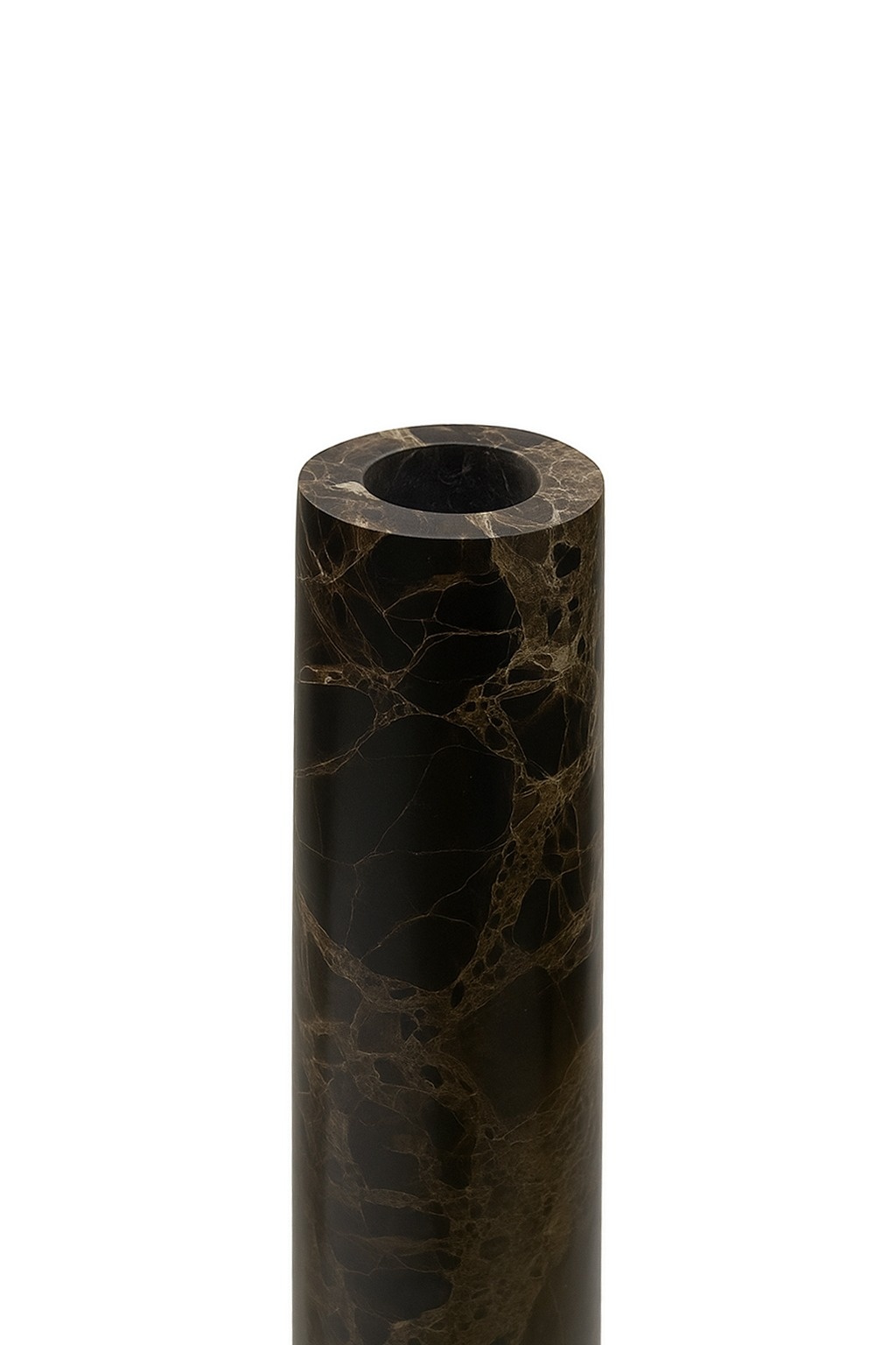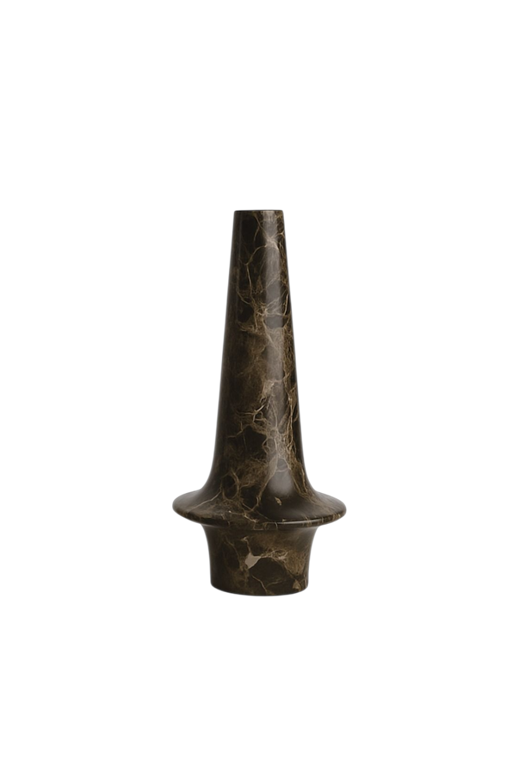 Die Tuvar-Vase hat ein auffälliges Design und ist aus einem Stück dunklem Emperador-Marmor gefertigt. Die hochglanzpolierte Oberfläche unterstreicht den luxuriösen Look der Vase.