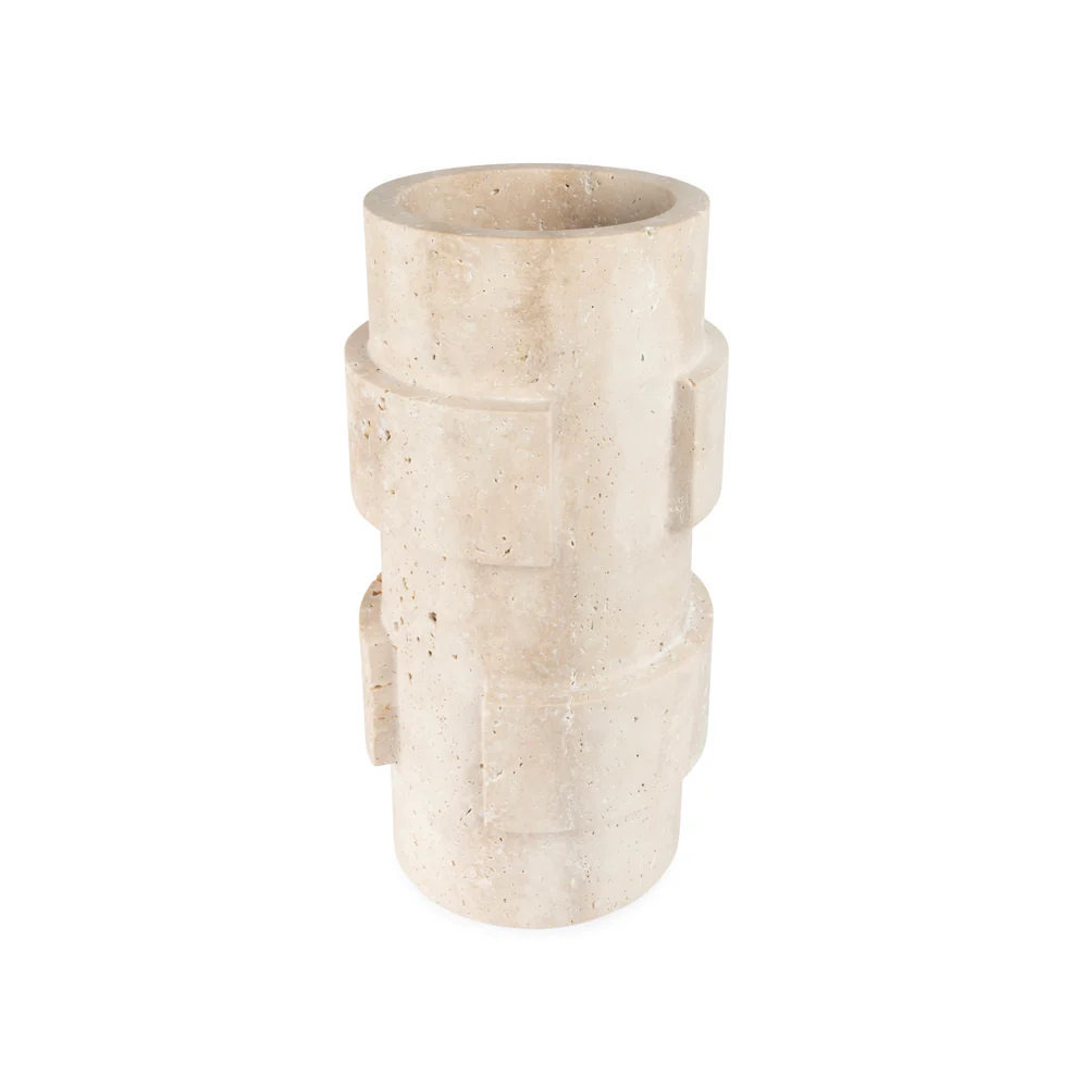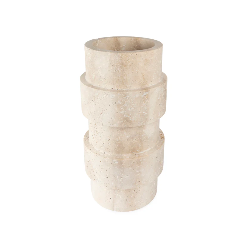 Skulptural und zeitlos: 'Vida' besteht aus natürlichem Travertin mit seinen charakteristischen warmen Farbtönen und einzigartigen Texturen. Ob als Vase für Trockenblumen oder als eigenständiges Dekorationsstück – ihre fließenden, organischen Rundungen verleihen jedem Raum mühelose Eleganz.