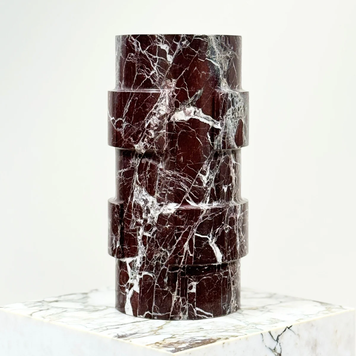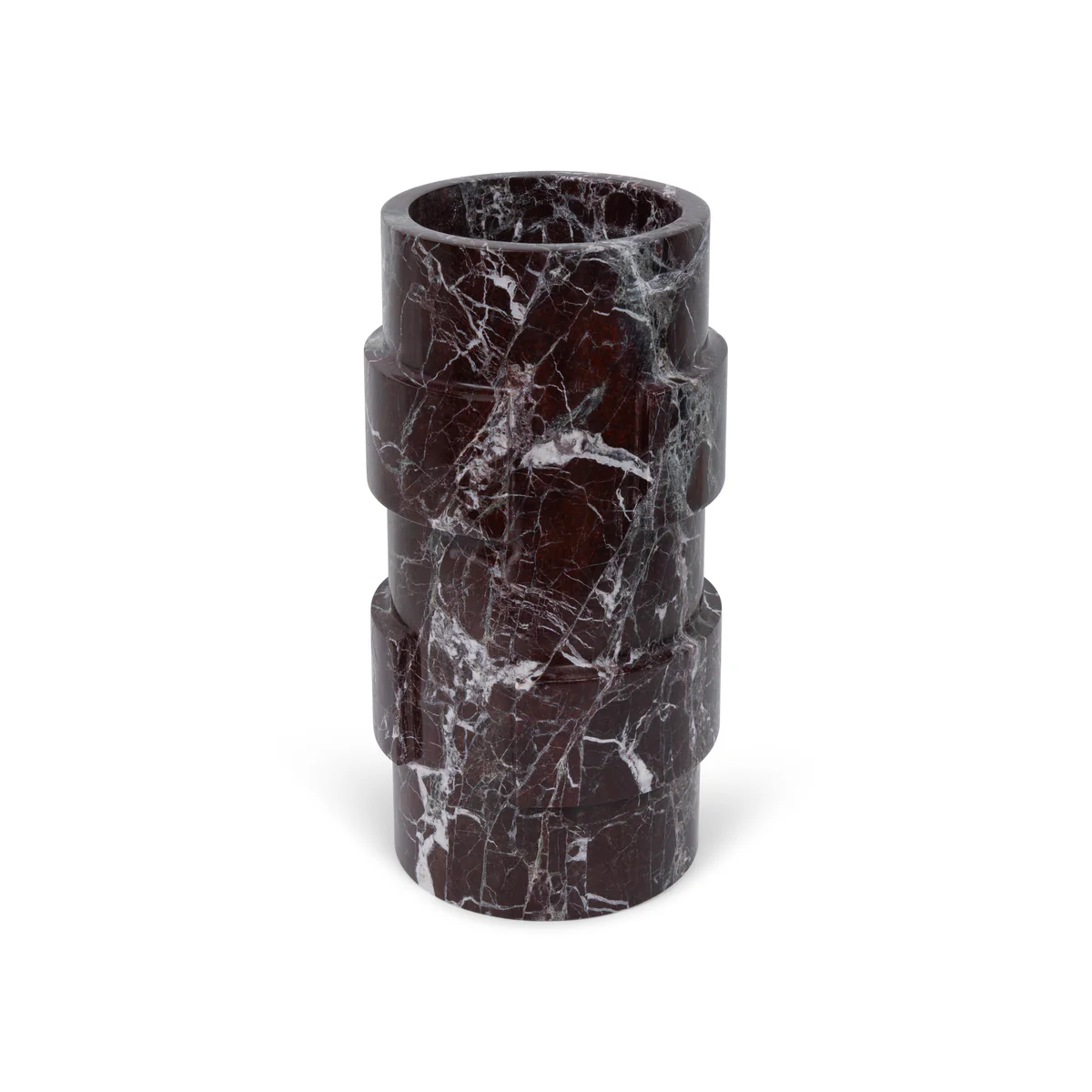 Diese 'Vida'-Vase ist aus burgunderrotem – auch Bordeaux genannt – Marmor gefertigt, erkennbar an der tiefroten Farbe mit weißen Adern. Ob du sie nun mit (Trocken- oder Kunst-)Blumen füllst oder einfach als Dekorationsobjekt aufstellst: Diese Vase zieht sofort die Blicke auf sich.
