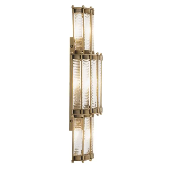 Laden Sie die prächtige Ästhetik der Wandleuchte Tiziano in Ihr Zuhause ein. Durch die Kombination von vintage-inspirierten Gittern und Endstücken mit zeitgenössischem Design strahlt diese raffinierte Wandleuchte einen zeitlosen Reiz aus. Der Trommelschirm in antikem Messing-Finish ist mit handgeschnitzten Glasstäben versehen.