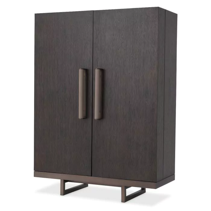 Der Weinschrank Harrison ist mit einem modernen Schrank aus mokkafarbenem, geradem Eichenfurnier ausgestattet und eine hochwertige Aufbewahrungslösung für Glaswaren, Weine und Spirituosen. Das Innere des Schranks ist mit Spiegelglas ausgestattet und enthält 4 Einlegeböden. Jede Tür hat 3 Einlegeböden mit erhöhtem Rand, damit die Gläser beim Öffnen nicht herausfallen können. Darüber hinaus verfügt dieser Schrank über 4 Hängeregale, die zusammen Platz für bis zu 16 Wein- oder Cocktailgläser bieten. Mittelbronzefarbene Beschläge und Griffe in Lederoptik machen dieses Stück zu einem wichtigen Merkmal in Ihrem Wohn- oder Esszimmer.