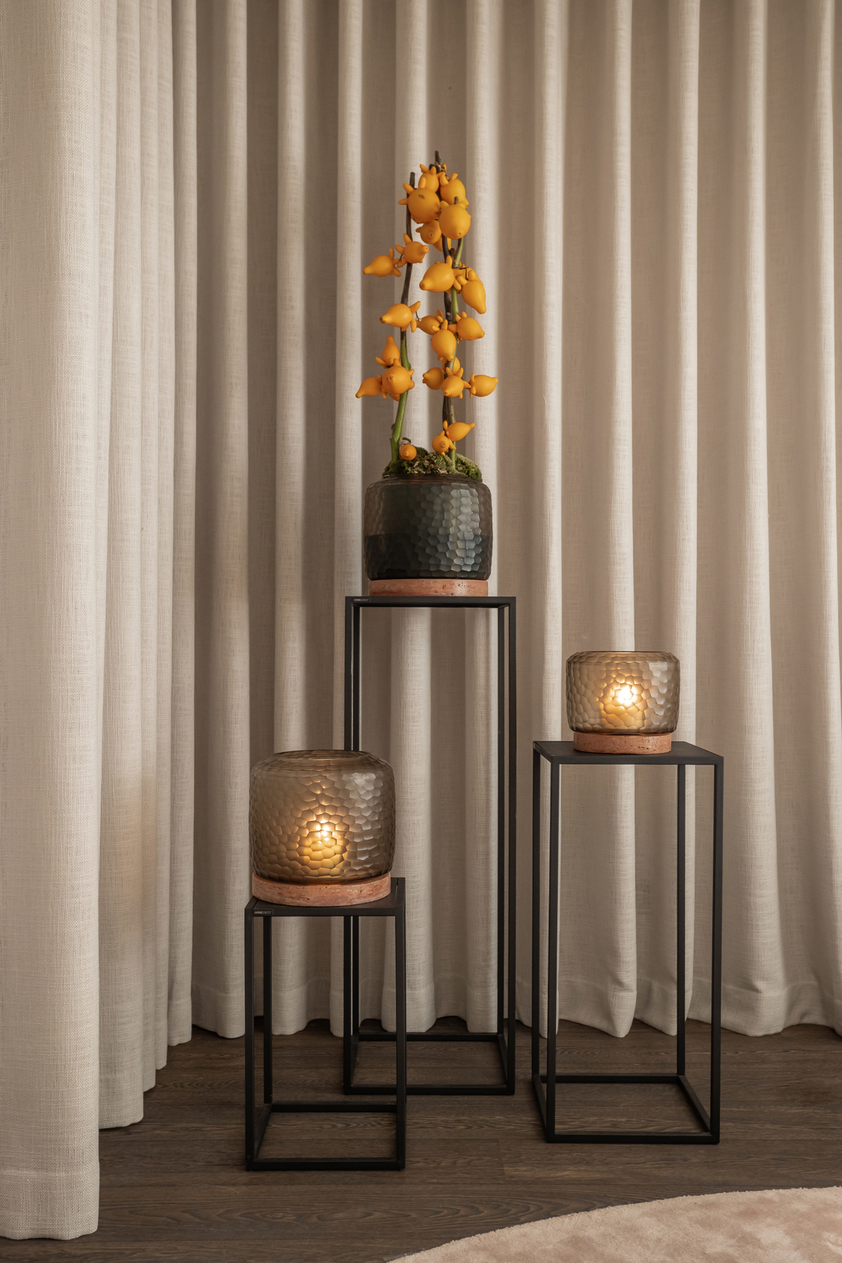 Das Windlicht Fogo von der Marke Dôme Deco ist 25 cm hoch. Dieses schöne Wohnaccessoire ist aus dunkelgrünem Glas gefertigt.
