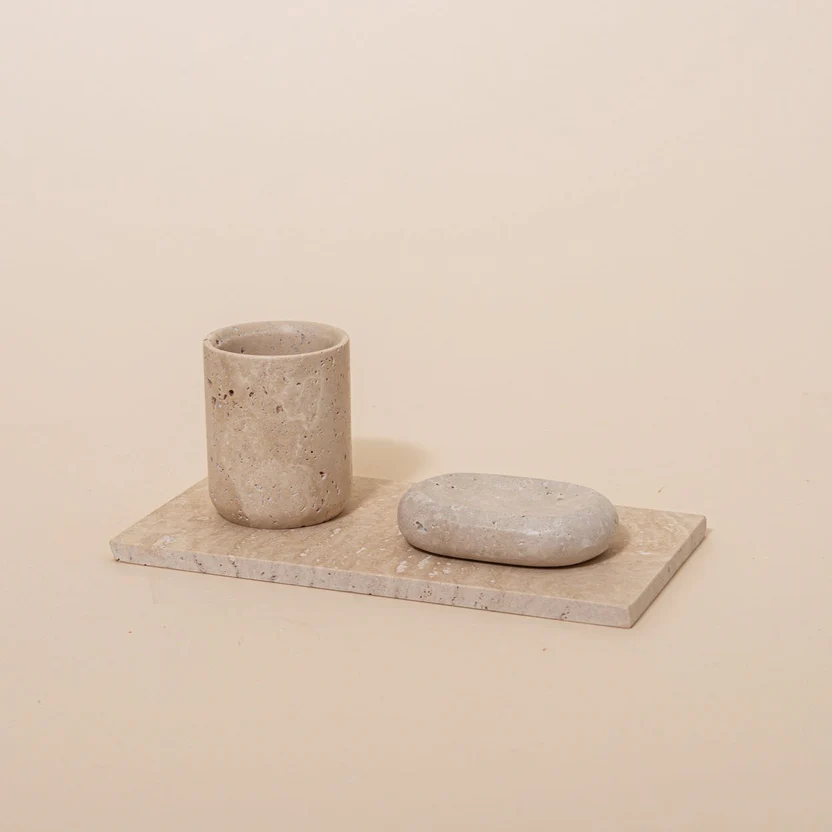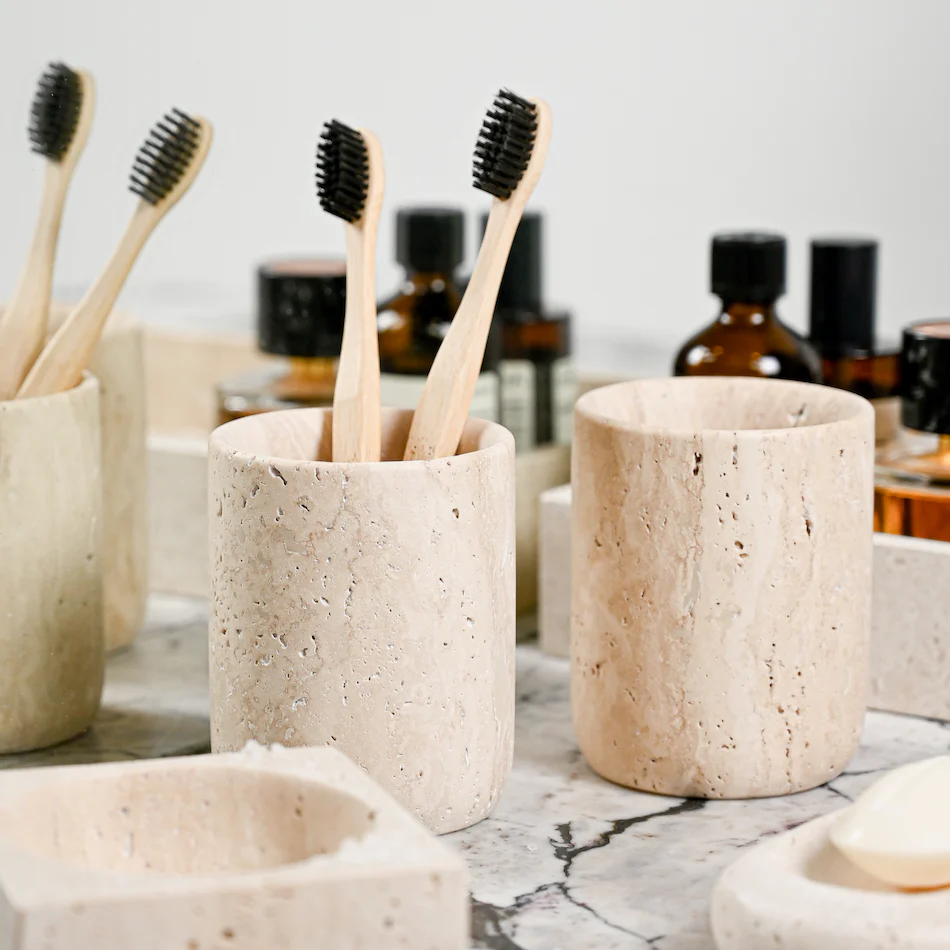 Die reichhaltigen Texturen und die organische Maserung des Travertins machen jedes Stück einzigartig, während die minimalistische Form jedem Raum einen Hauch von Luxus verleiht. Ob im Badezimmer, im Büro oder auf der Arbeitsplatte – dieser Becher bietet eine wunderschöne Lösung für die tägliche Organisation.