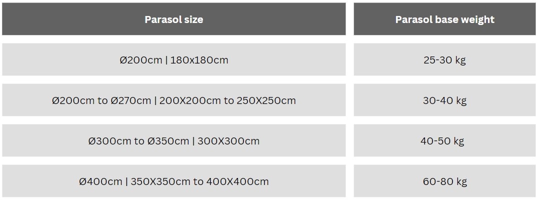 When installing a parasol in your garden, a parasol base is a must. Of course, you don't want the parasol to fall over and/or be blown away. The choice for a parasol base is influenced by many aspects. For instance, how heavy the frame of the parasol is, but also whether the parasol is placed in a private garden or in an open garden with a lot of wind. In general, you can apply the following rules for parasols with a base in the middle;