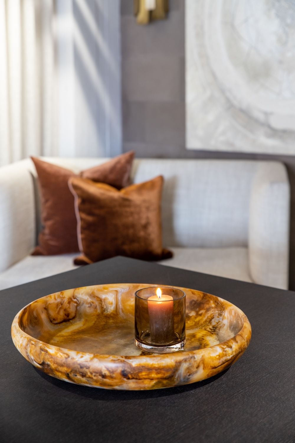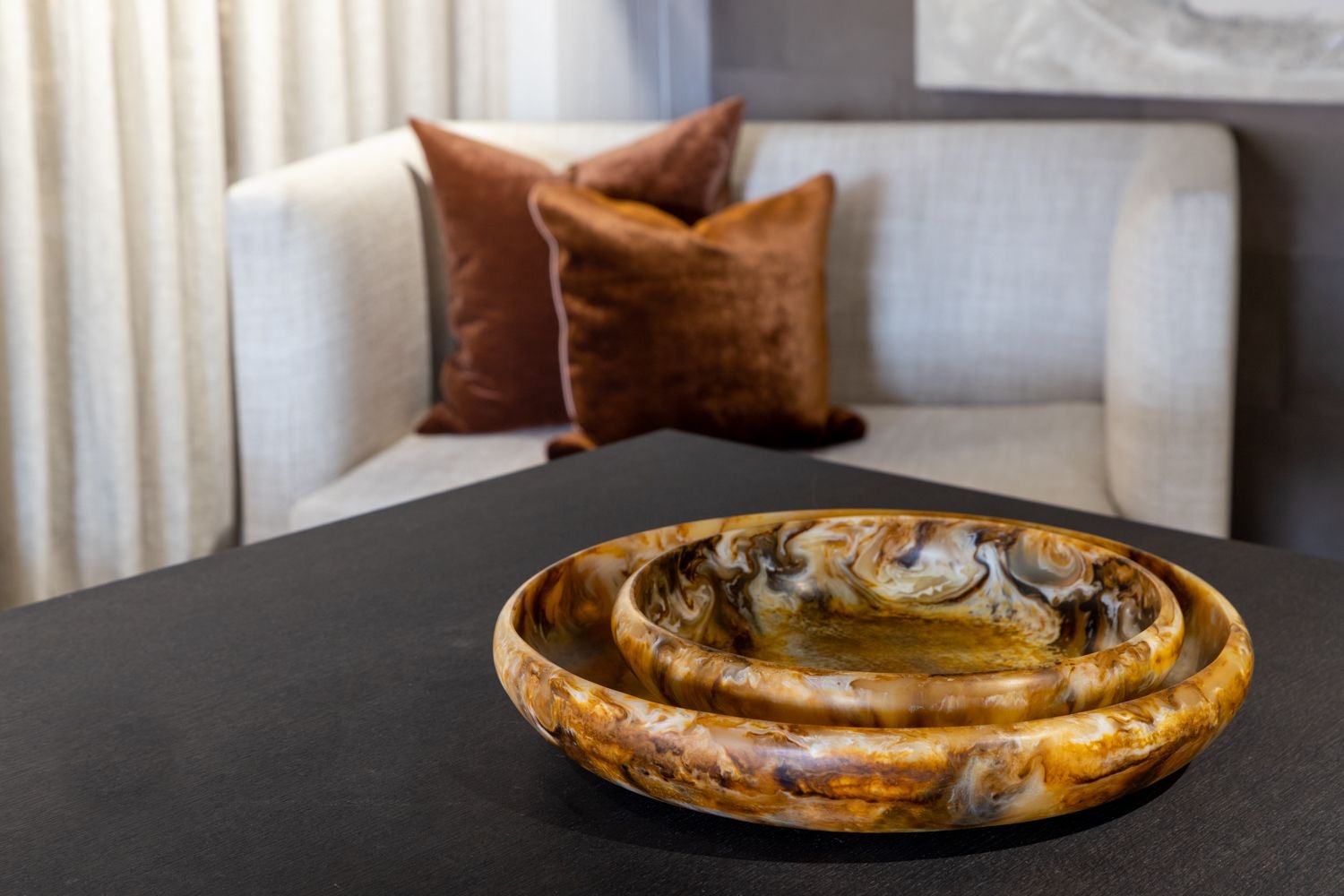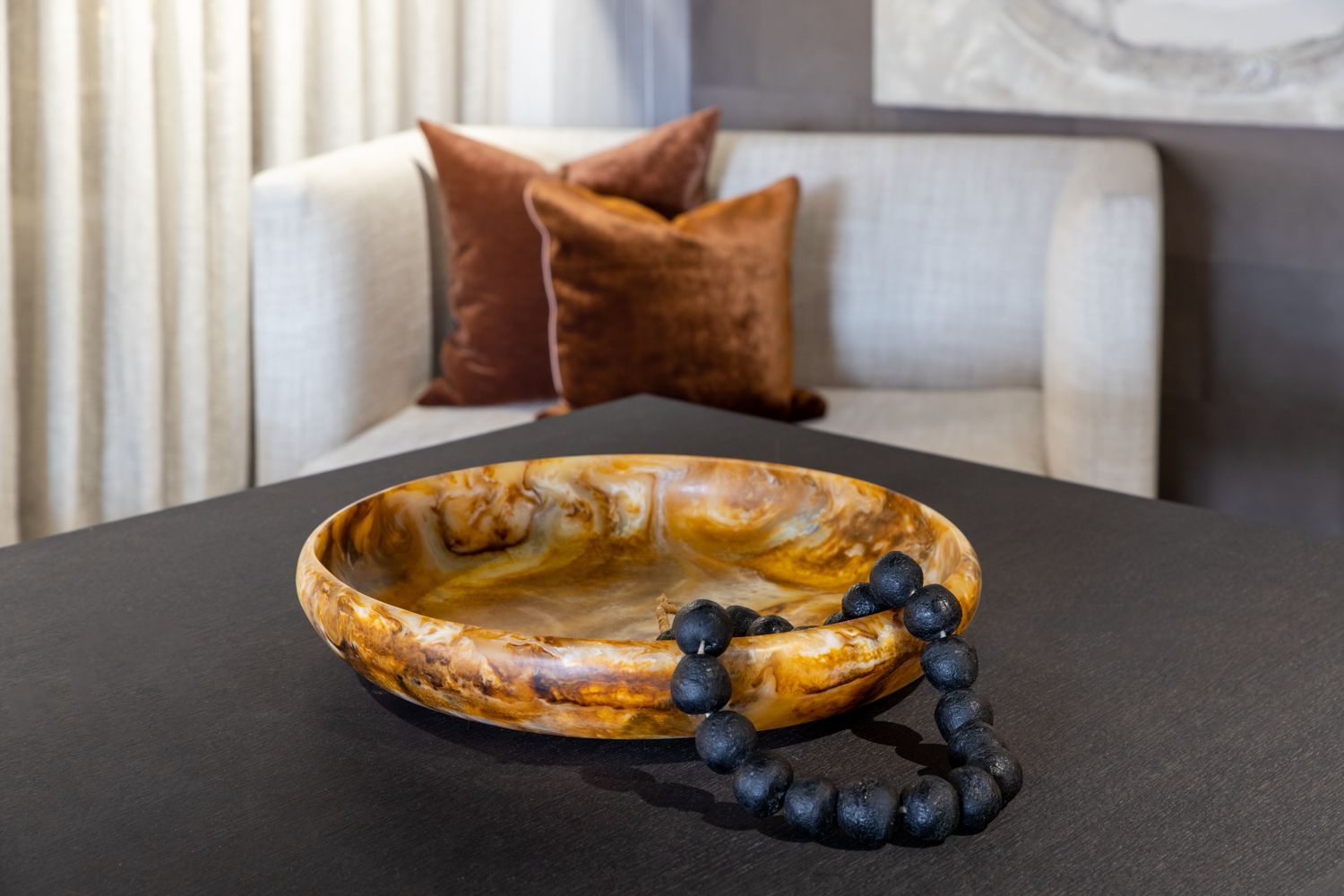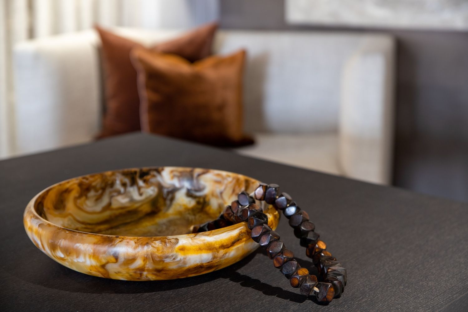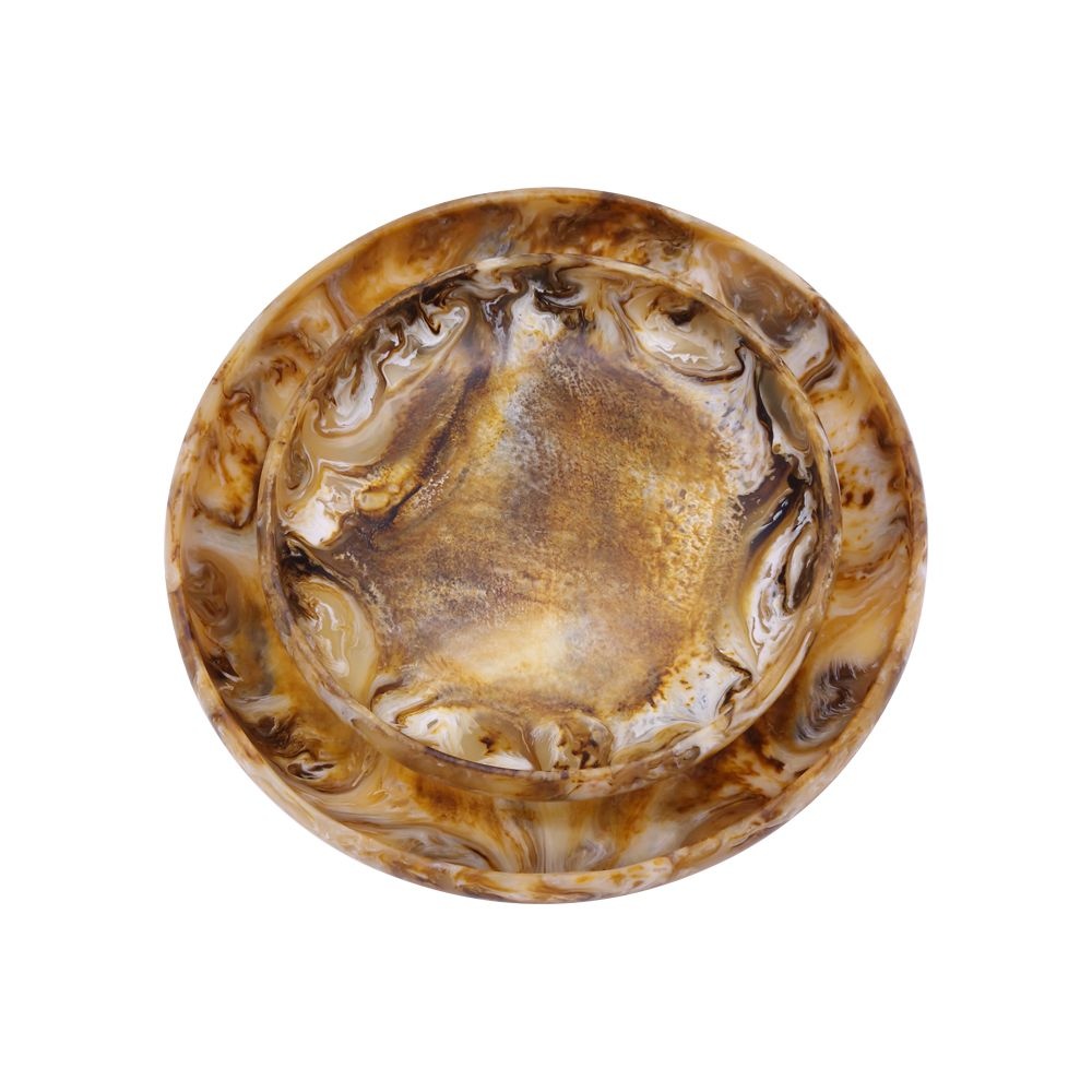 This beautiful bowl is handmade of resin in mixed brown and ecru shades. A striking item in the interior. Stylish and at the same time practical to use as a fruit bowl, for example.