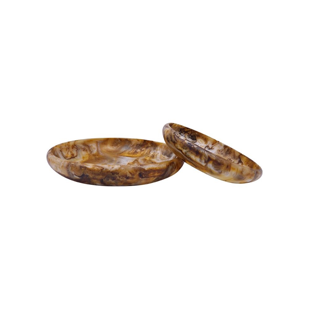 Clear studs are placed under the shell to protect the surface. When the dishes are used to serve food, it is only suitable for cold food. The dishes should only be hand washed in warm water. Resin may appear 'matte' after washing and can be rubbed with a drop of olive oil to restore shine.