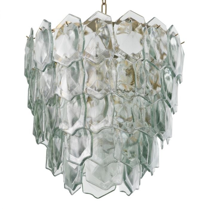 The Elias Chandelier exudes the look and feel of 1950s designer lighting. This Eichholtz ceiling pendant is suspended from a chain. The fixture, which has a vintage brass finish, is adorned with over 60 pieces of handmade glass. Skilled artisans meticulously craft each piece. The perfect centerpiece for any lifestyle room, this stylish and timeless design will be a talking point in your home.