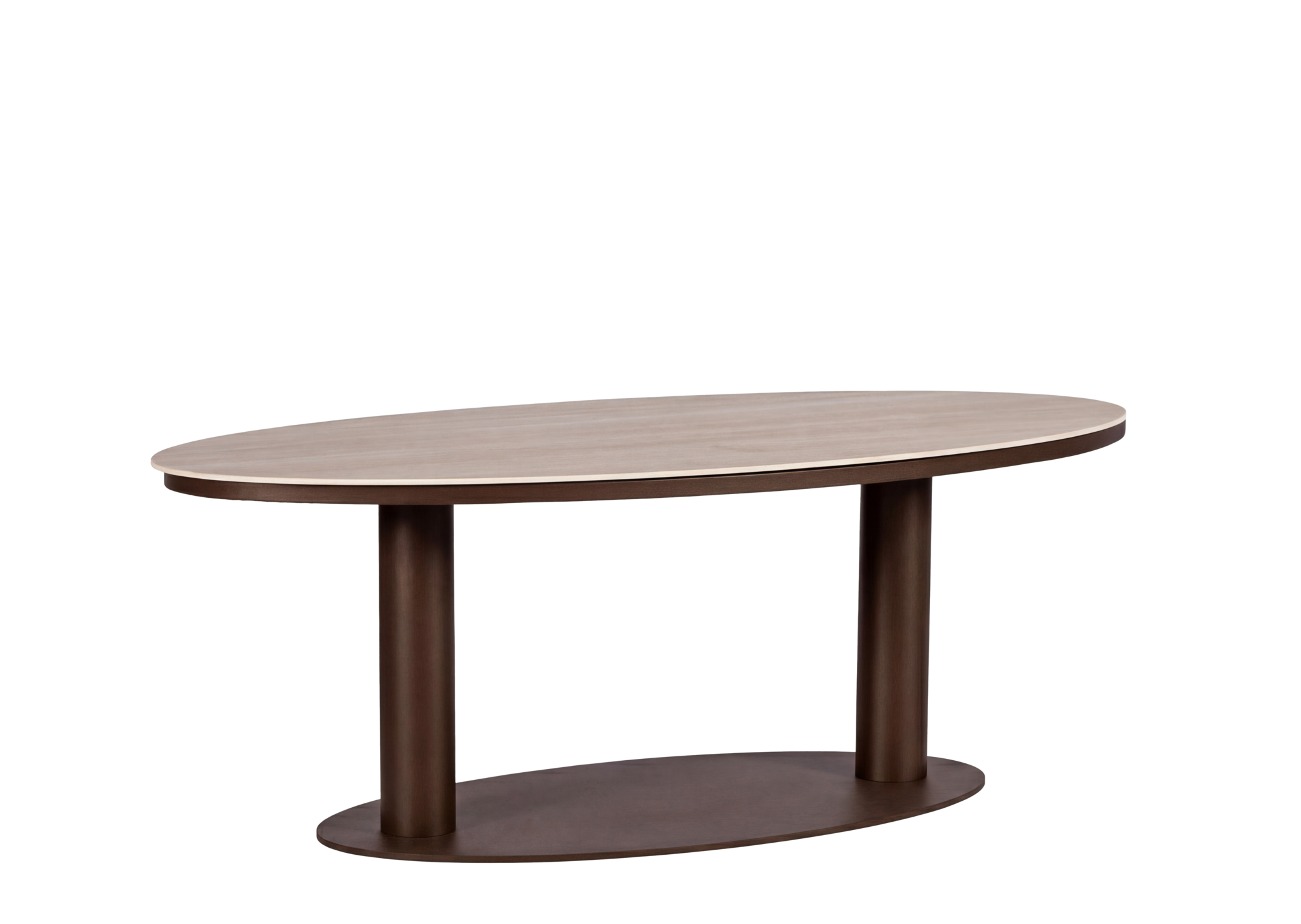 The Covo low table, with oval dimensions of 120 by 60 centimetres, brings a relaxed and refined look to any outdoor lounge. The aluminium frame is available in several shades, including Bronze, Sienna and Salix. Each colour gives the table its own unique atmosphere: Bronze adds warmth and depth, Sienna brings a natural accent and Salix creates a light and modern look. The travertine tabletop forms a calm centrepiece within the design and gives the table a subtle sense of natural luxury. The oval shape makes the Covo lounge table ideal as a central element in a seating area. The soft lines and elegant top create an inviting look that refines the entire setting. Thanks to durable all-weather materials, the table can remain outside throughout the season while retaining its quality and well-maintained appearance. The Covo lounge table combines comfort, design and durability into a timeless eye-catcher for any outdoor space.