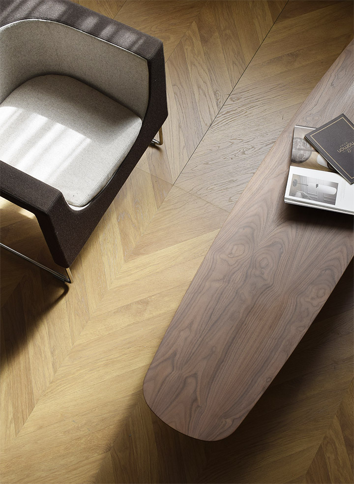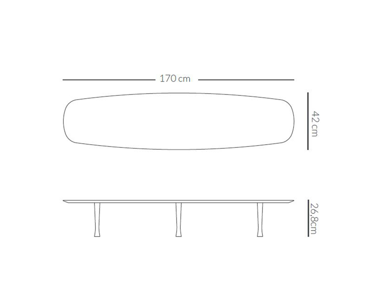 Long coffee table made of walnut wood. Surprising for its long proportions and diamond-shaped leg layout. Its low height eliminates visual barriers and frees up the space it occupies.