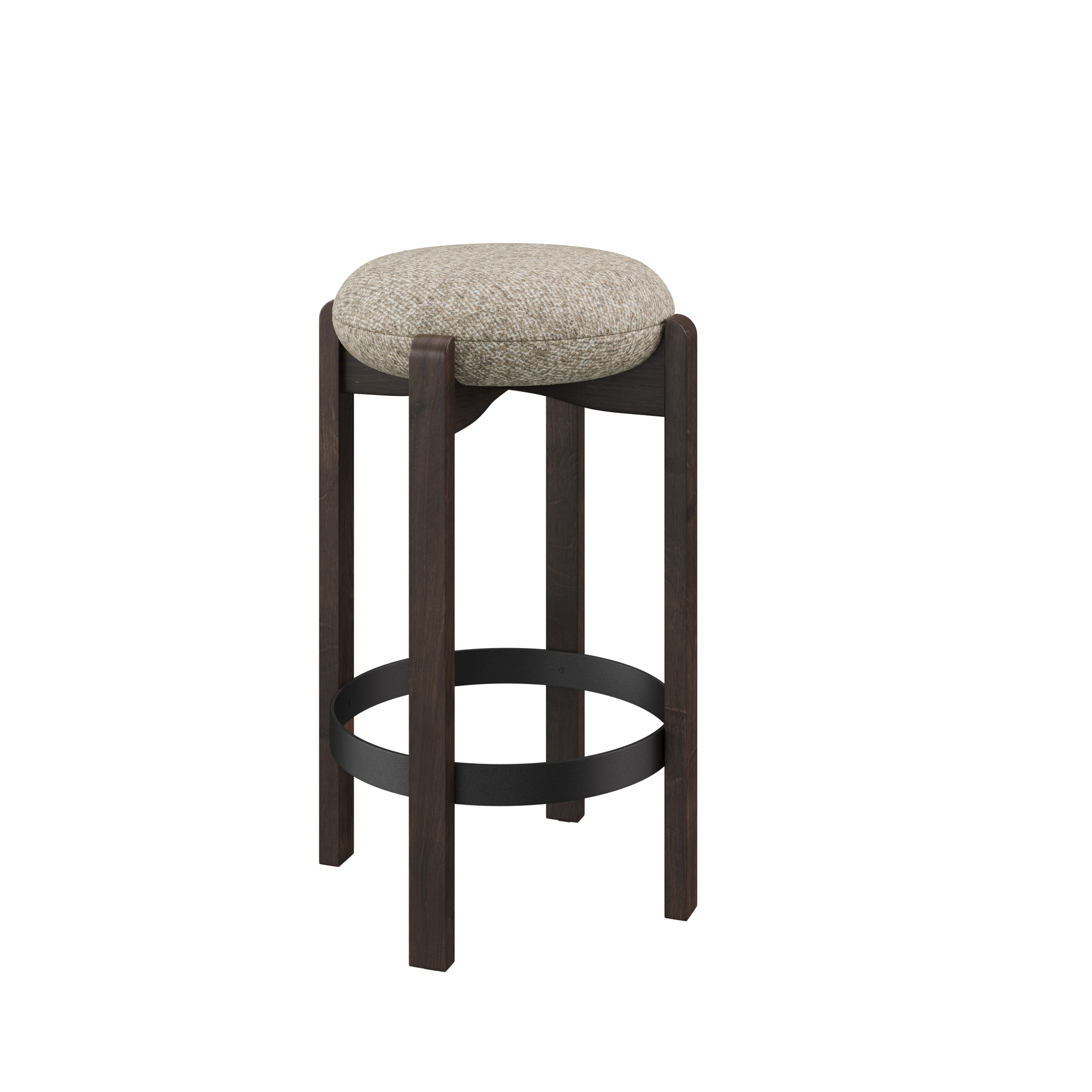 This counter stool has a modern and sleek design with a minimalist look. The seat is round and upholstered in a light grey fabric, providing comfort and a neutral look. The base consists of four straight legs made of black metal, connected by a ring-shaped footrest that offers both sturdiness and functionality. The combination of soft upholstery and robust metal makes the chair stylish and suitable for both modern interiors and more industrial settings.