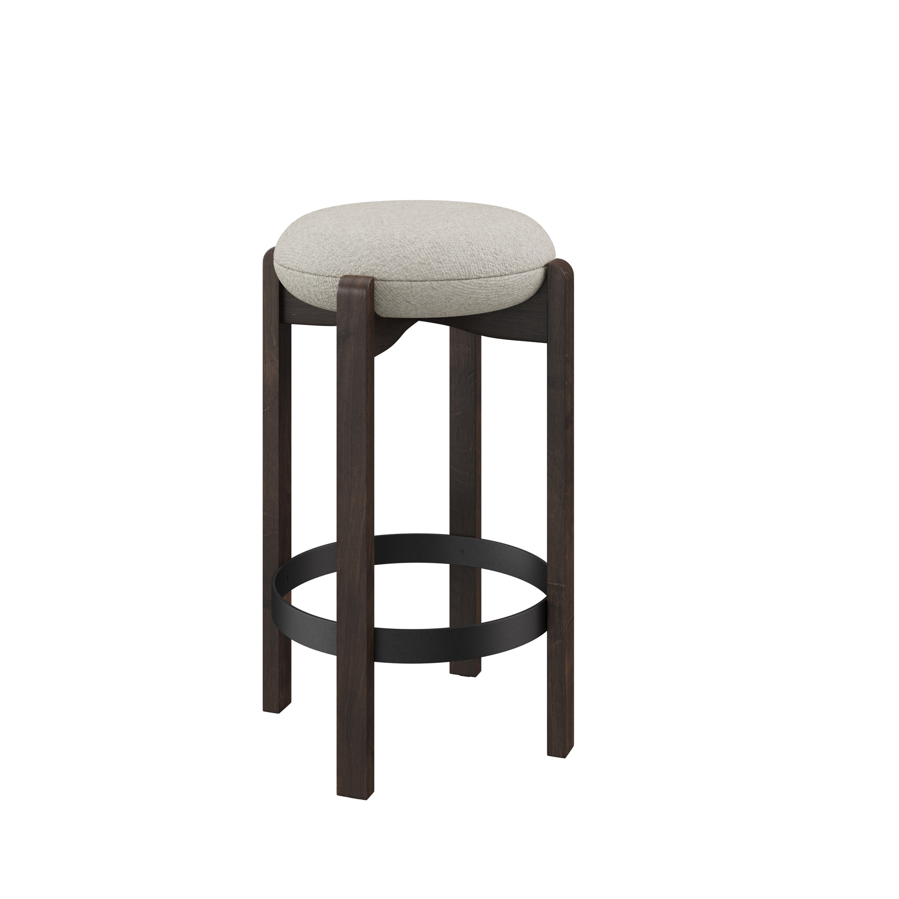 This counter chair has a modern and sleek design with a minimalist look. The seat is round and upholstered in a light grey fabric, providing comfort and a neutral look. The base consists of four straight legs made of black metal, connected by a ring-shaped footrest that offers both sturdiness and functionality. The combination of soft upholstery and robust metal makes the chair stylish and suitable for both modern interiors and more industrial settings.