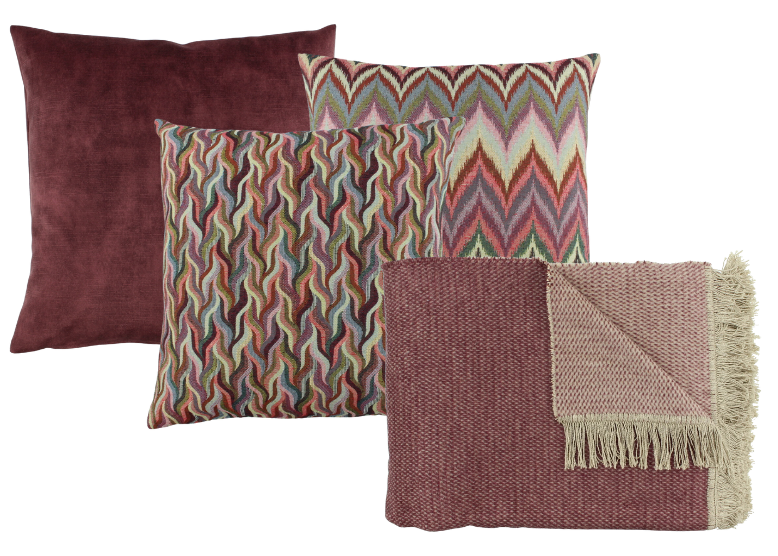 The cushion combinations have been selected carefully and are created to inspire you. Dare to combine various colours in your interior! In this set the colour Aubergine is used in different prints and fabrics. We included a perfect matching plaid. At the bottom of this page you will find direct links to the individual items for more product information per decorative cushion.