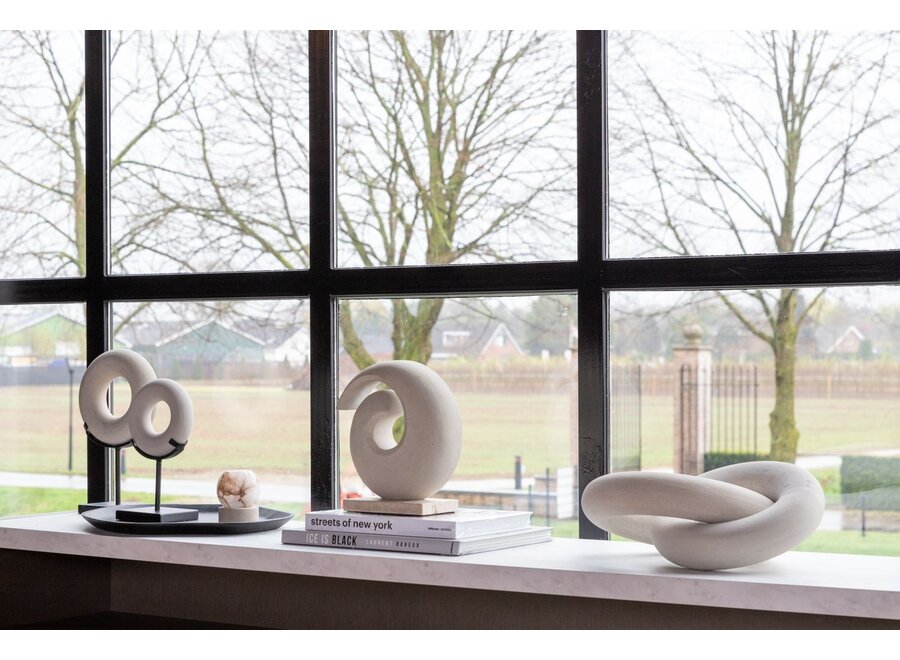 Decorative object 'Magone' is a sandstone donut on stand. It is an object with a minimalist design that excels in simplicity. The ring is placed on a standard of aluminum in a matte black color, under which felt is applied to protect surfaces.