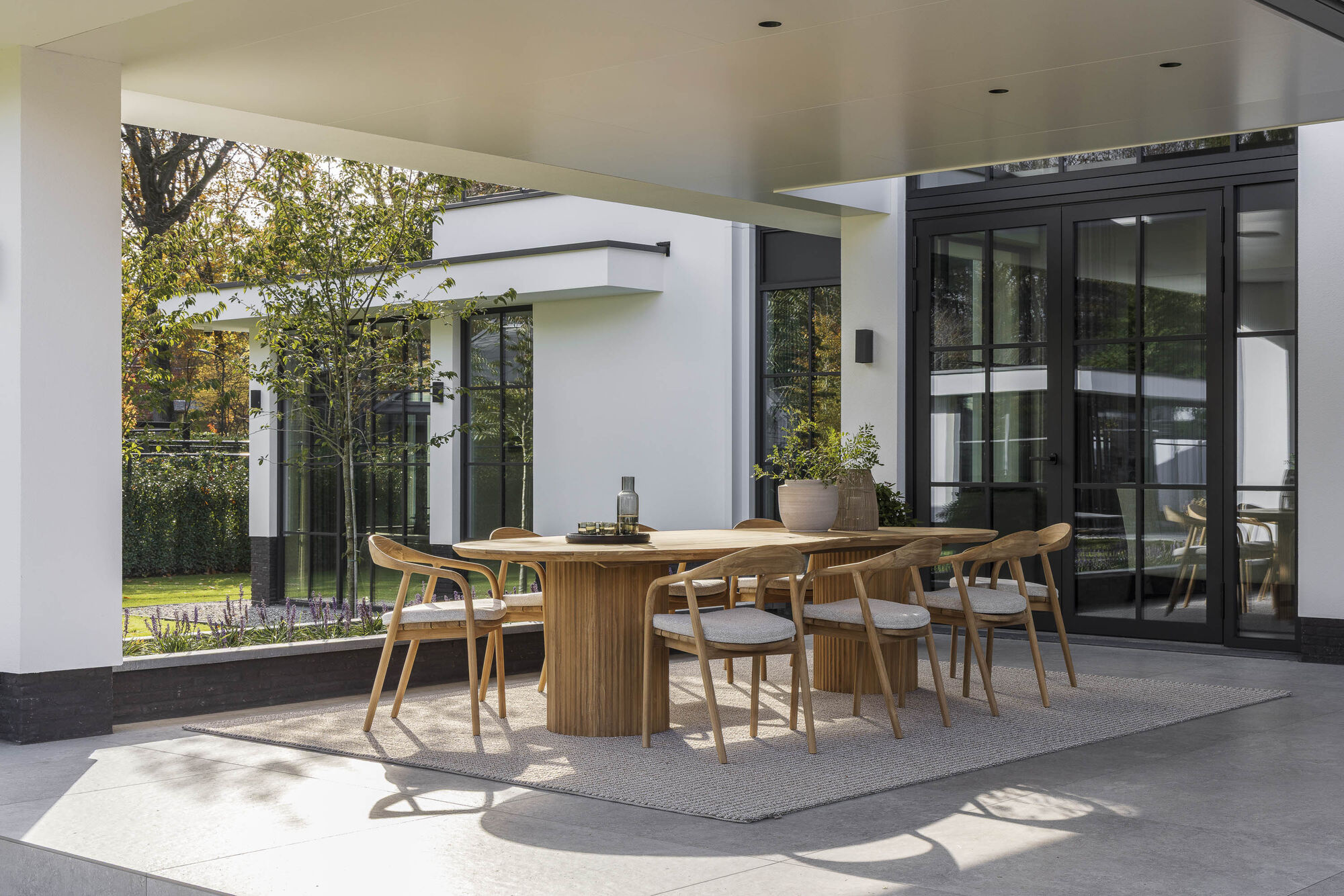 The Venezia collection introduces a new design language to Max and Luuk. The tables are designed as flowing landscape elements, with soft contours that lend any outdoor space a natural elegance. With both dining and low dining models, executed in organic shapes and the characteristic kidney silhouette, Venezia brings a playful yet refined rhythm to any seating arrangement. The solid teak top forms the warm heart of the collection. The gentle curves and subtle variations in the wood make each table unique, while the rich texture of the teak creates an inviting, natural look. Yet Venezia never feels heavy: the design is light, supple, and harmonious, as if the table has naturally formed within the space. The sculptural column base, composed of vertical lines, gives the tables a modern, almost architectural look. It provides stability without disrupting the softness of the design and allows the top to float. Low dining creates a relaxed setting where evenings last longer, while the dining version forms a familiar focal point for dinners and gatherings. The characteristic kidney shape adds an extra dimension. The asymmetrical shape invites a playful interpretation of the space and creates a dynamic whole that stands out from traditional tables. Perfect for those who prefer to embrace outdoor living in a more free, organic way. Venezia is a collection for those who appreciate natural materials, modern simplicity, and soft movement in design. A series of tables that feels as pleasant as it looks, enriching any outdoor space with character and tranquility.