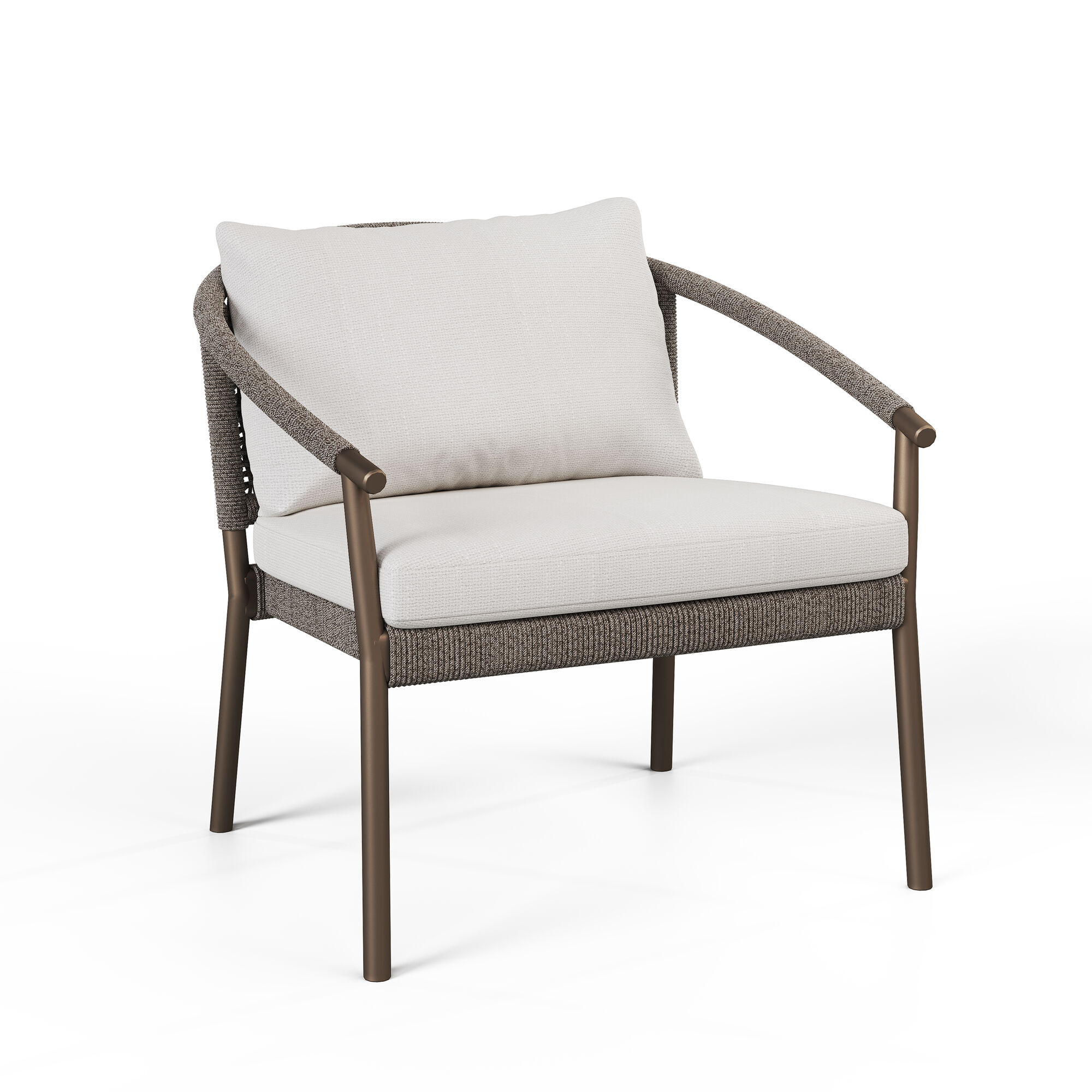 The slender bronze aluminium frame provides an elegant base for the round, double-woven wengé rope. The curved backrest and soft lines reflect the signature design of the Emilia dining and high dining chairs, while offering a more spacious and relaxed seating experience. The open weave keeps the silhouette light and airy, with the rounded armrests subtly highlighting the craftsmanship.