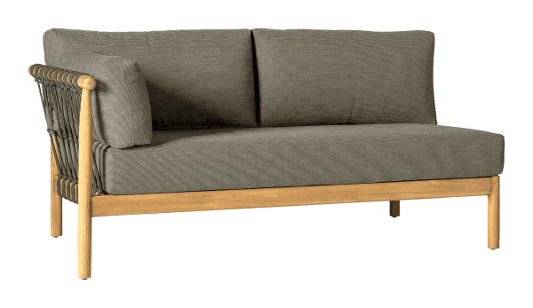 The Valente collection has a sophisticated design with high, slender legs, giving the teak furniture an airy feel. This Max & Luuk designer furniture is finished with a dark green rope. In this, the thick round wire is connected by a slimmer wire. This has created a subtle, open weave that supports the sophisticated design of the Valente. The green-gray Emerald cushions match both brilliantly with the original hue of the teak and the graying hue the wood takes on over time. In addition to a sofa module with a left or right armrest, there is a corner and an intermediate module allowing you to combine to your heart's content, matching Max & Luuk where there is a suitable solution for every outdoor space.