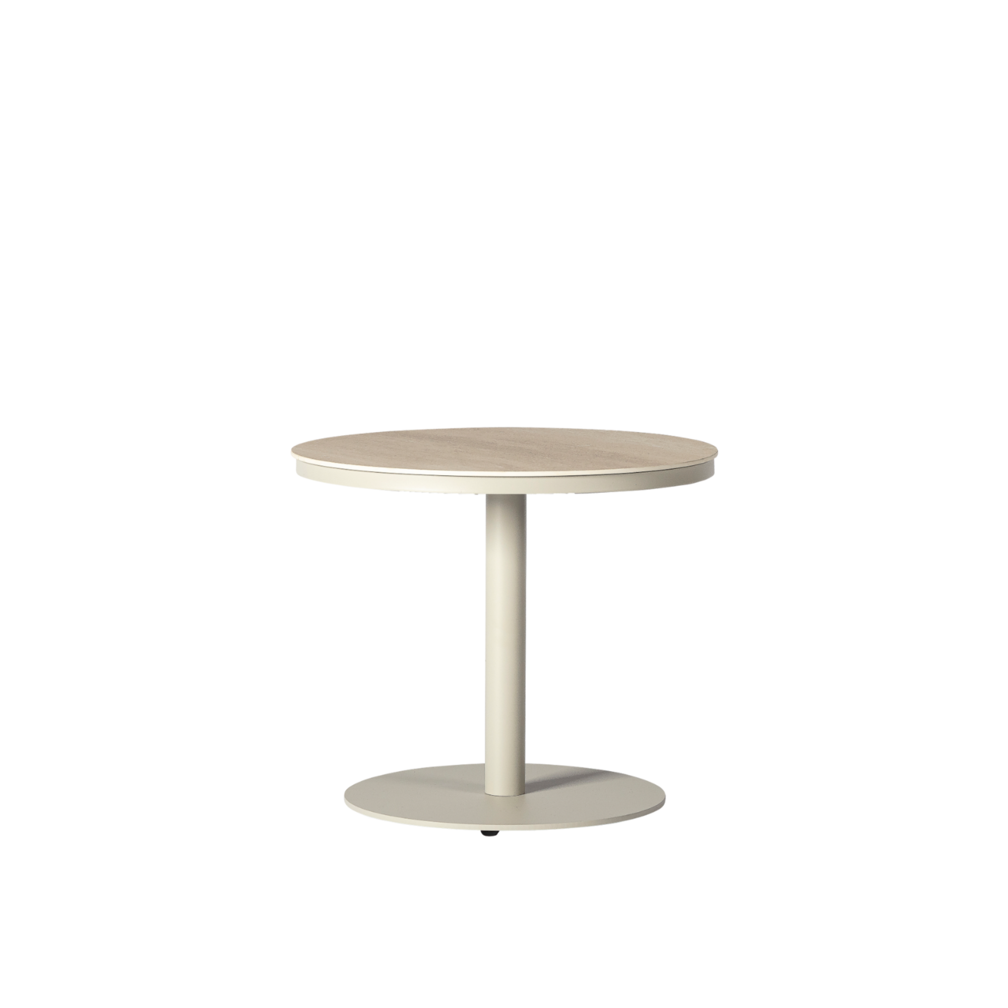 The Salerno table has an elegant round shape. The travertine-colored ceramic top has a tactile texture that gives it the appearance of genuine natural stone, making the table both visually and tactilely interesting. Ceramic offers the Salerno table numerous advantages: it is extremely durable, scratch-resistant, and weather-resistant, making it perfect for both indoor and outdoor use. The top retains its beauty even after prolonged exposure to the elements. The aluminum base is available in both linen and bronze shades, making the Salerno table easy to combine with a variety of chairs, from modern designer chairs to more classic models. The low tables in the Salerno series can also be playfully combined to create a dynamic table arrangement. Salerno not only adds style and functionality to your space but also offers endless possibilities for personalizing your outdoor space or dining area.