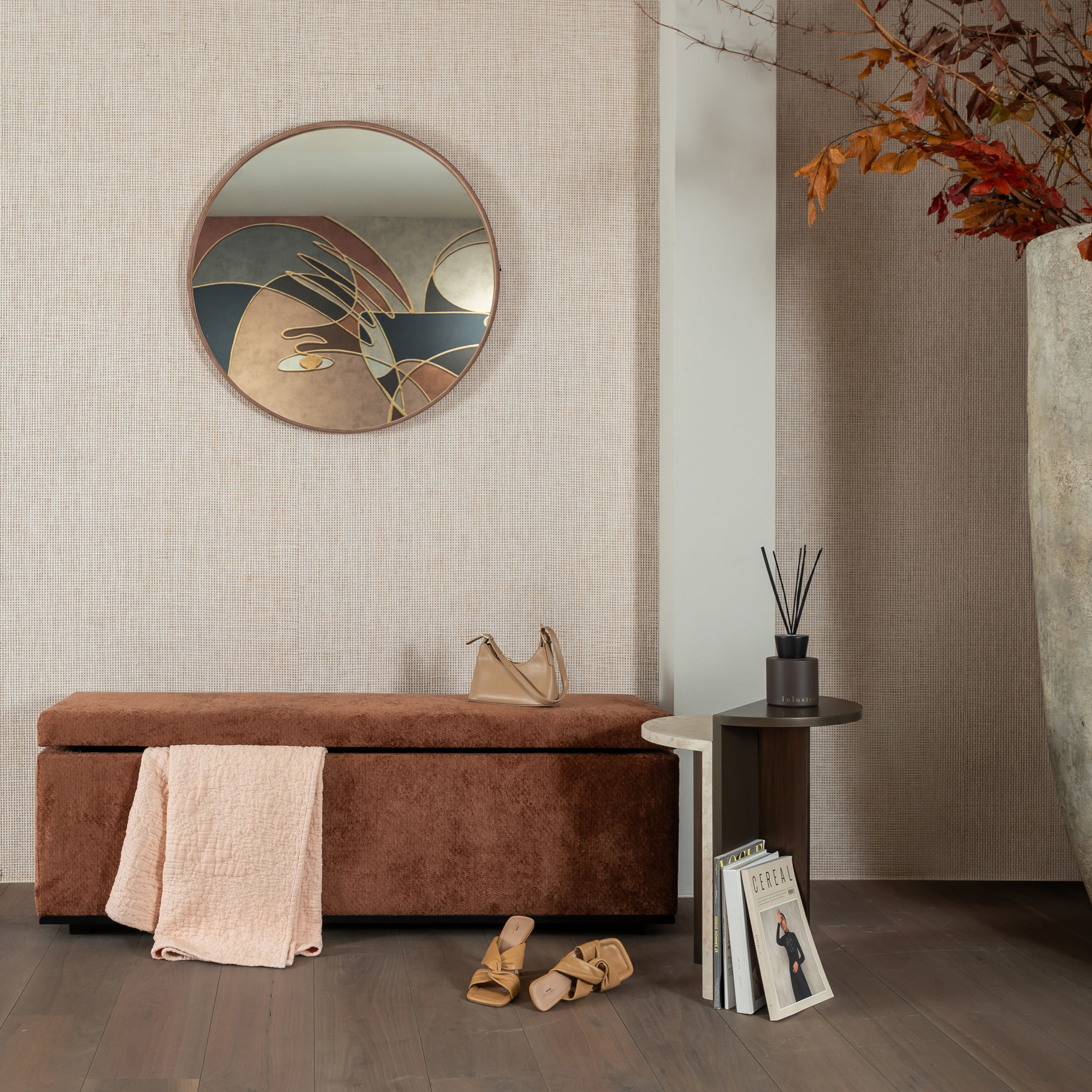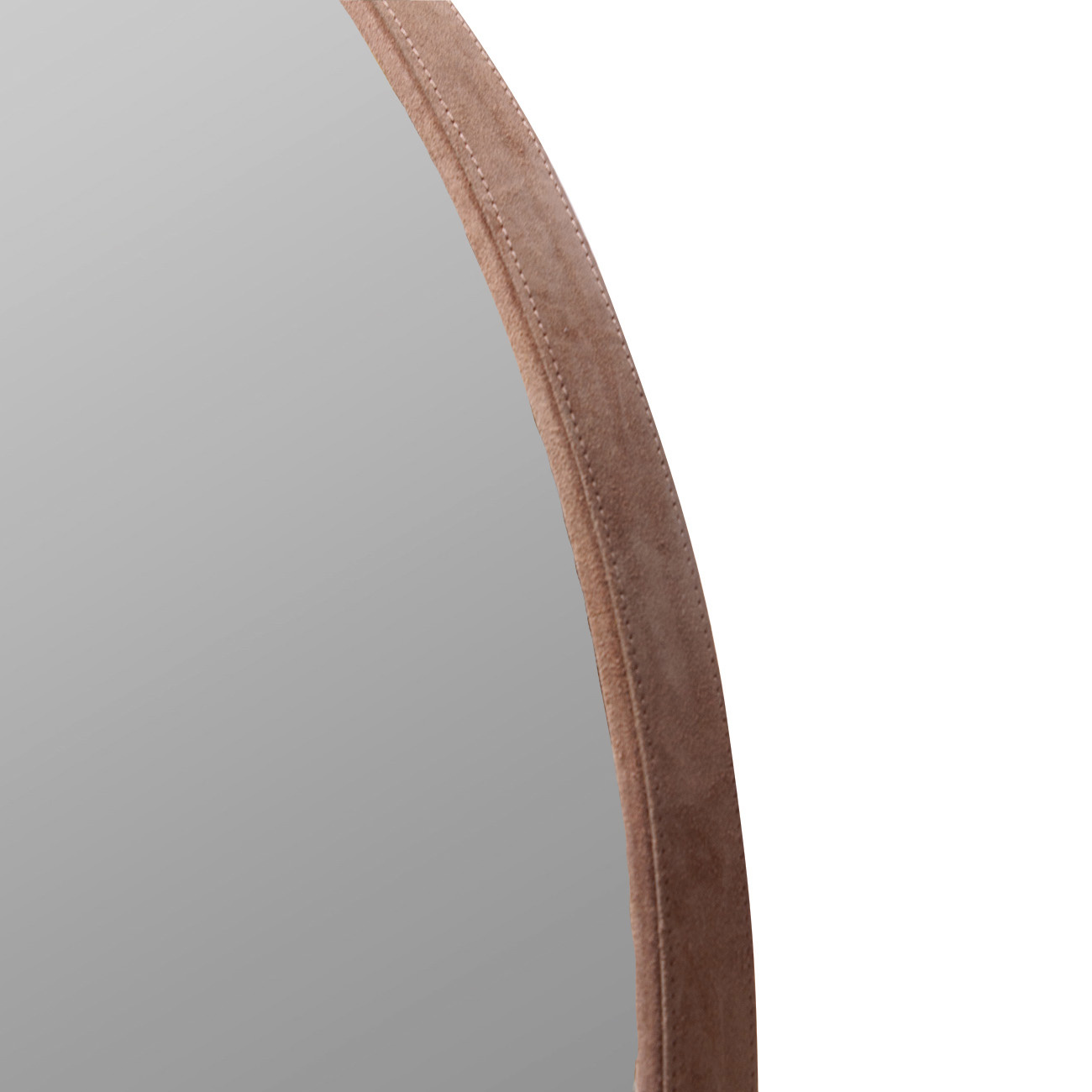 The Malebo mirror has an elegant round design with a suede border in the colour pink. With a diameter of 78 cm, it is a subtle eye-catcher for any room, perfect for a warm and modern look.