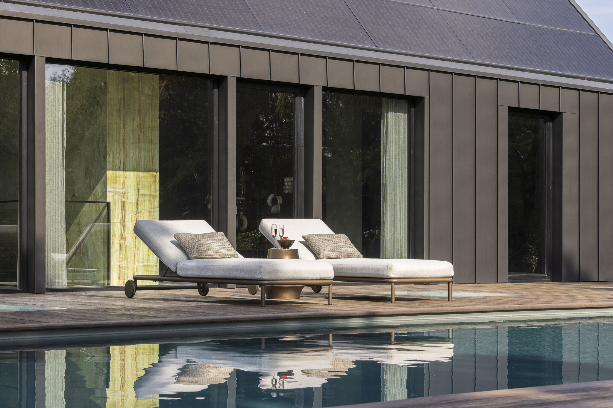 The Loreto mobile lounger adds a playful and dynamic element to Studio Borek's sculptural Loreto collection. This adjustable sunbed on wheels moves effortlessly with the rhythm of the day: from the first rays of sunshine in the morning to the gentle evening breeze. With its soft volumes, flowing contours and understated chic appearance, the lounger offers an exceptionally comfortable place to relax, either individually or as an extension of a larger lounge setting. The warm bronze aluminium frame provides stability and a calm base, while the generous all-weather cushions in natural tones create an almost indoor-like softness. Subtle rope and belt details add extra texture and refinement. The Loreto mobile lounger stands for flexibility, luxury and a carefree, timeless form of outdoor living.