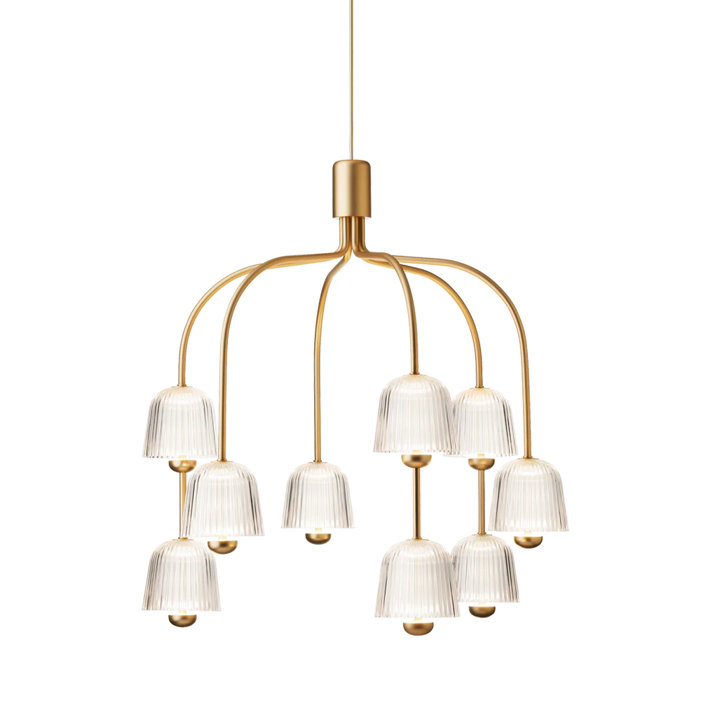 The Asteea 9 is a modern chandelier with double light sources per arm and ribbed shades that create indirect, atmospheric lighting.