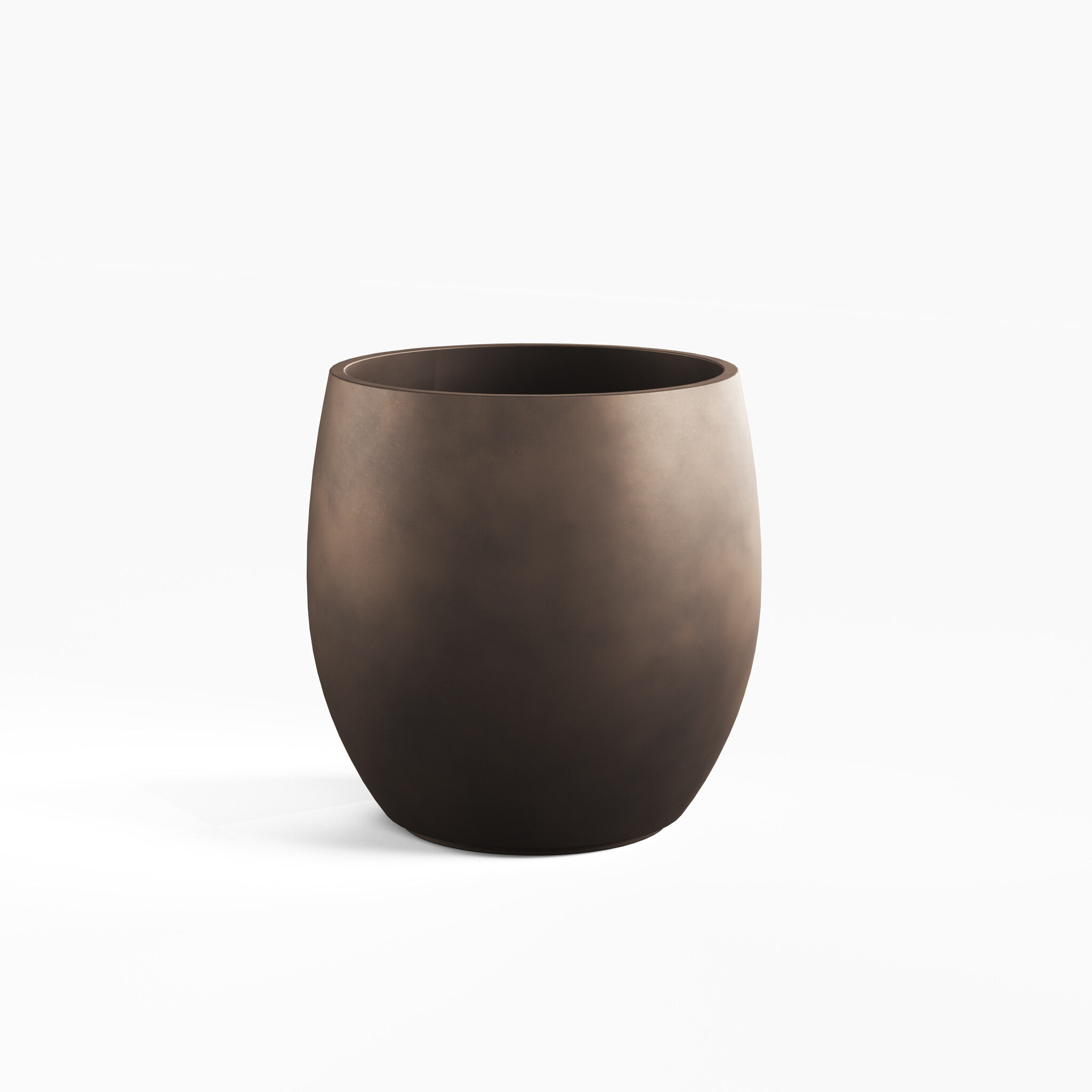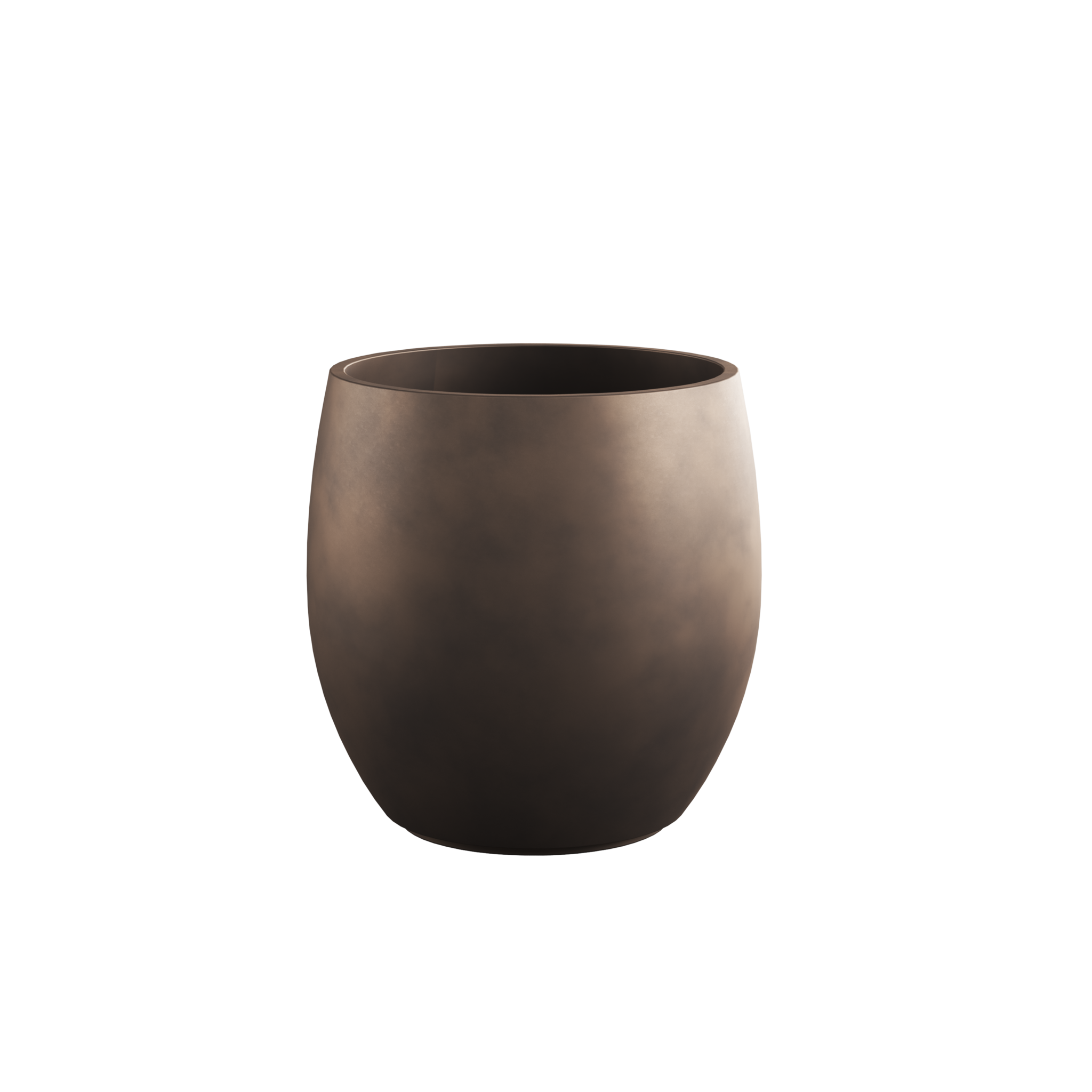 Aurora is designed to add depth and ambiance to outdoor spaces through form, material, and color. The series consists of three generous planters, each uniquely creating a stage for greenery. The material is GRC, a high-quality blend of cement, sand, and fiberglass that creates a strong yet refined look. The bronze finish is carefully applied to give the planter a warm, rich glow that complements natural plantings beautifully. The round version, approximately 84 centimeters high with a diameter of 84 centimeters, has a generous volume that effortlessly accommodates larger specimen plants, Mediterranean trees, or rich planting mixes. Its gentle curves and subtle color make it an elegant focal point in large gardens and patios.