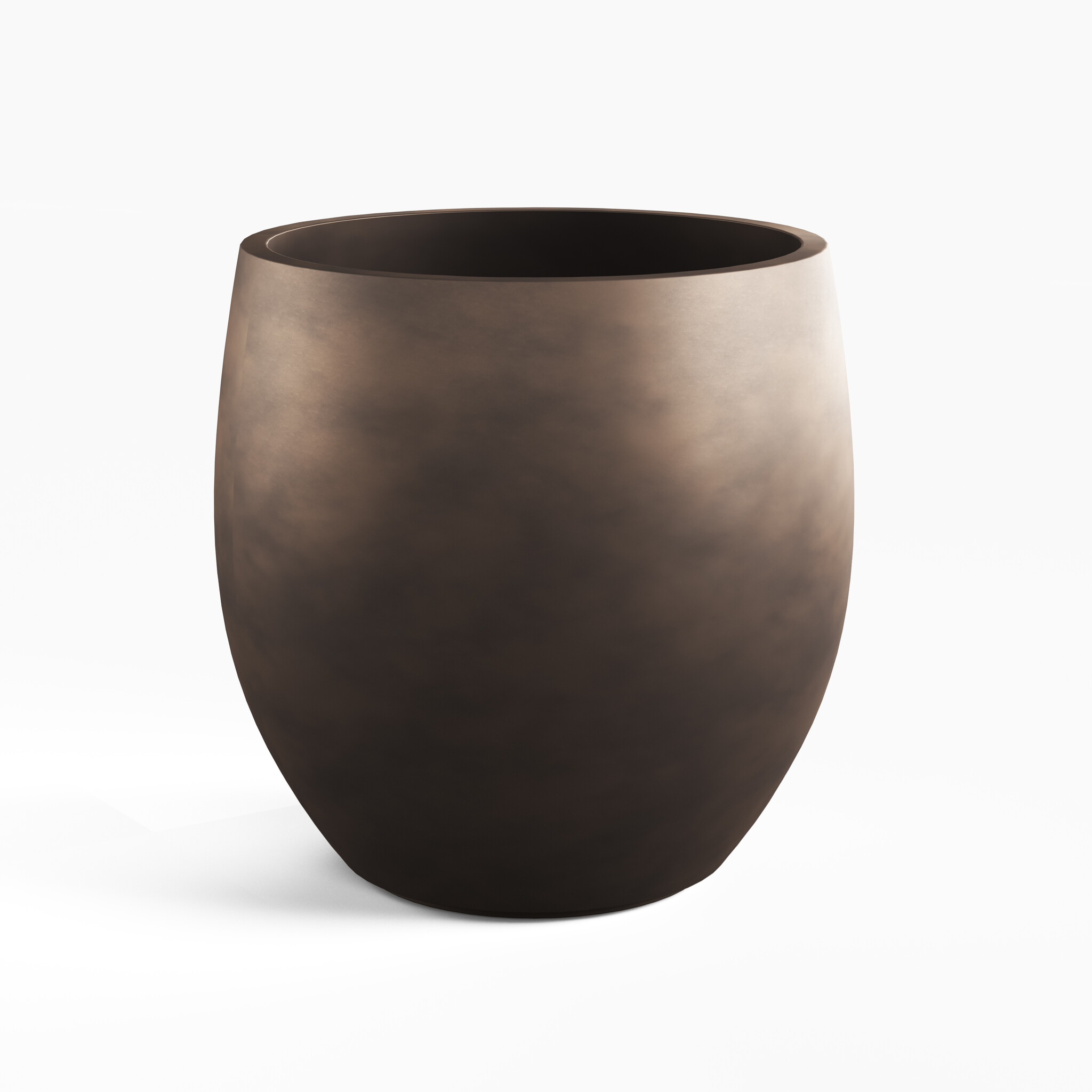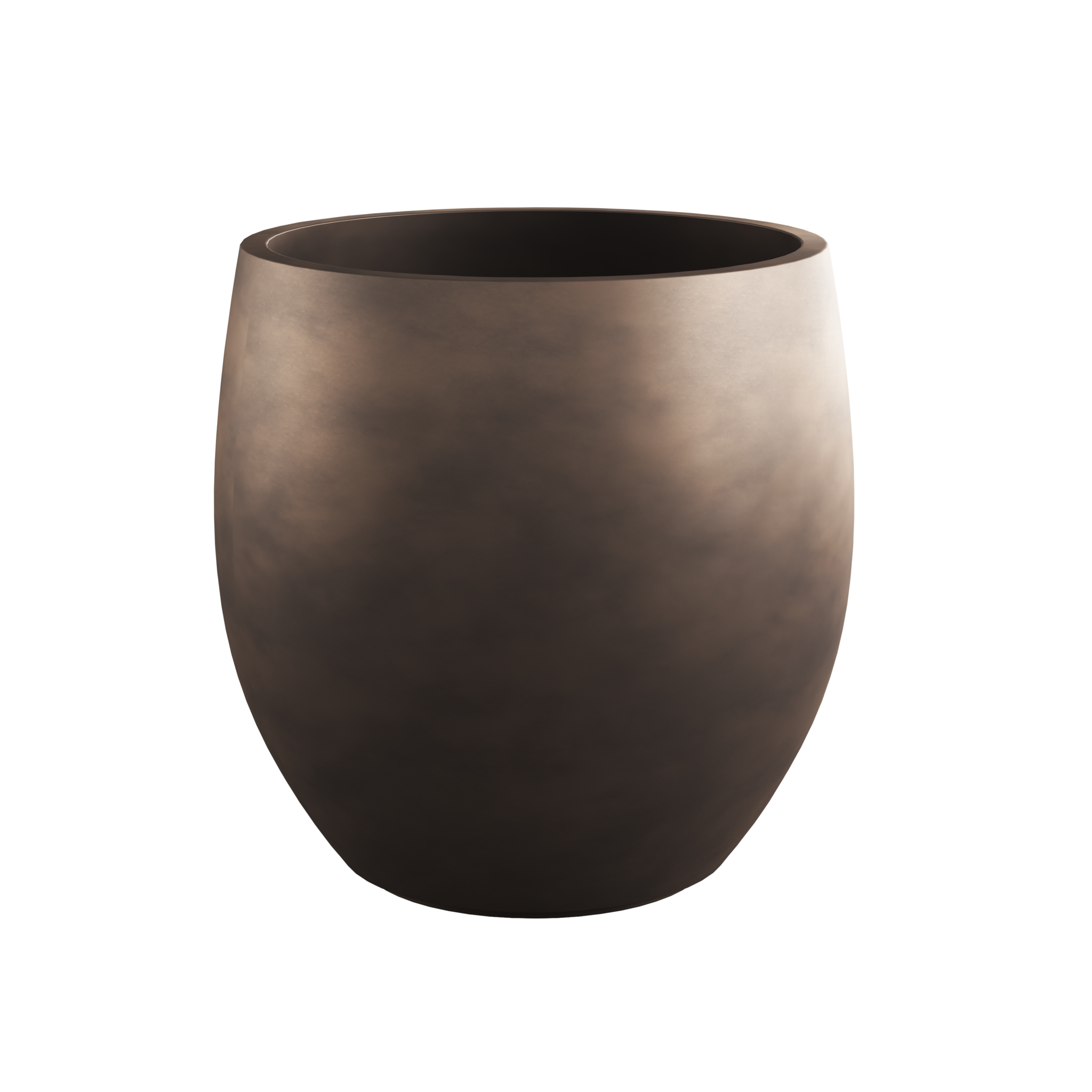 Aurora is designed to add depth and ambiance to outdoor spaces through form, material, and color. The series consists of three generous planters, each uniquely creating a stage for greenery. The material is GRC, a high-quality blend of cement, sand, and fiberglass that creates a strong yet refined look. The bronze finish is carefully applied to give the planter a warm, rich glow that complements natural plantings beautifully. The round version, approximately 84 centimeters high with a diameter of 84 centimeters, has a generous volume that effortlessly accommodates larger specimen plants, Mediterranean trees, or rich planting mixes. Its gentle curves and subtle color make it an elegant focal point in large gardens and patios.