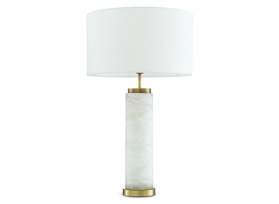 Table Lamp LXRY exudes sophistication. This lovely lamp has a cylindrical body of alabaster and a base and socket with antique brass finish. It is completed with an off-white drum shade to suit all décors. Ideal for hallways, living rooms, dining areas, bedrooms and more.