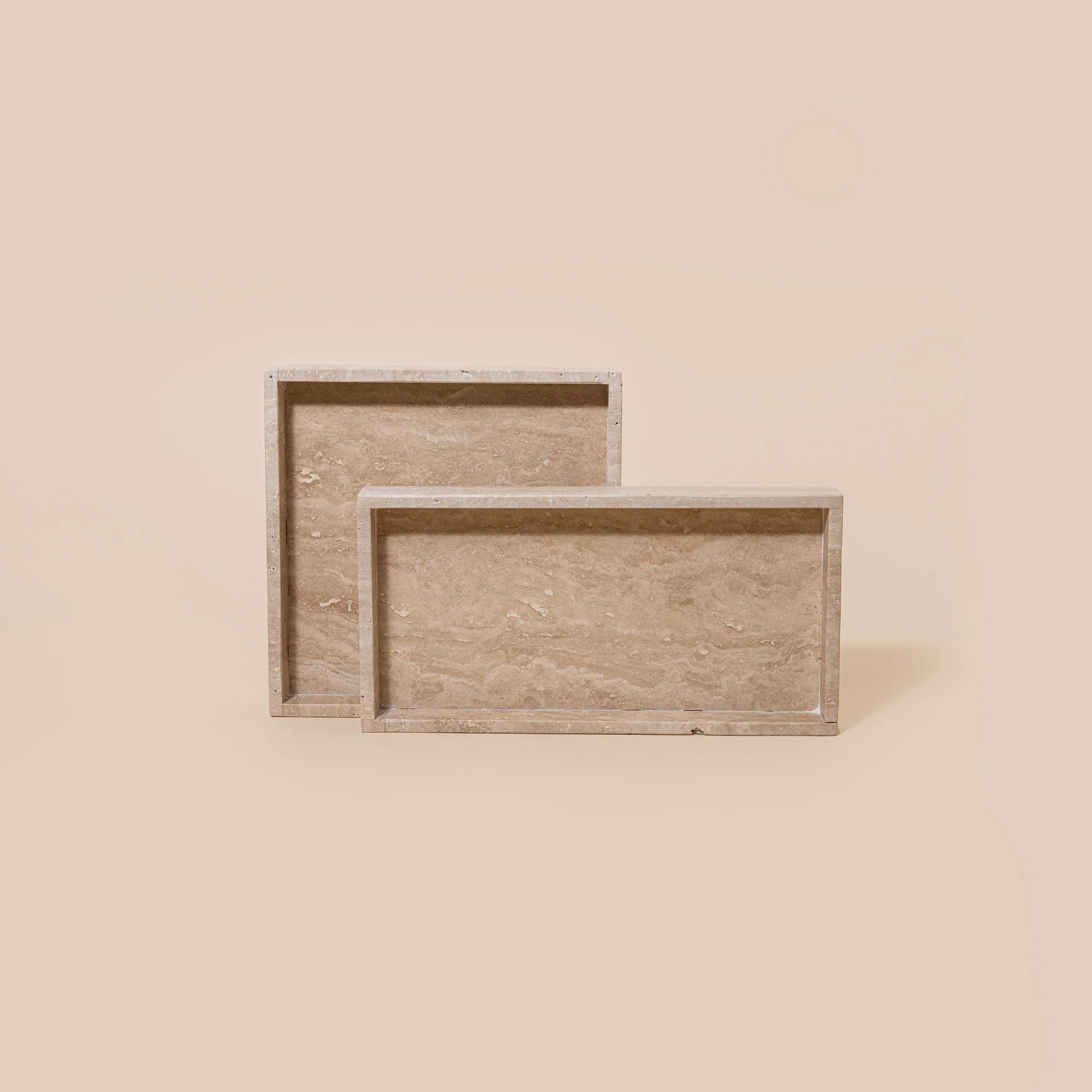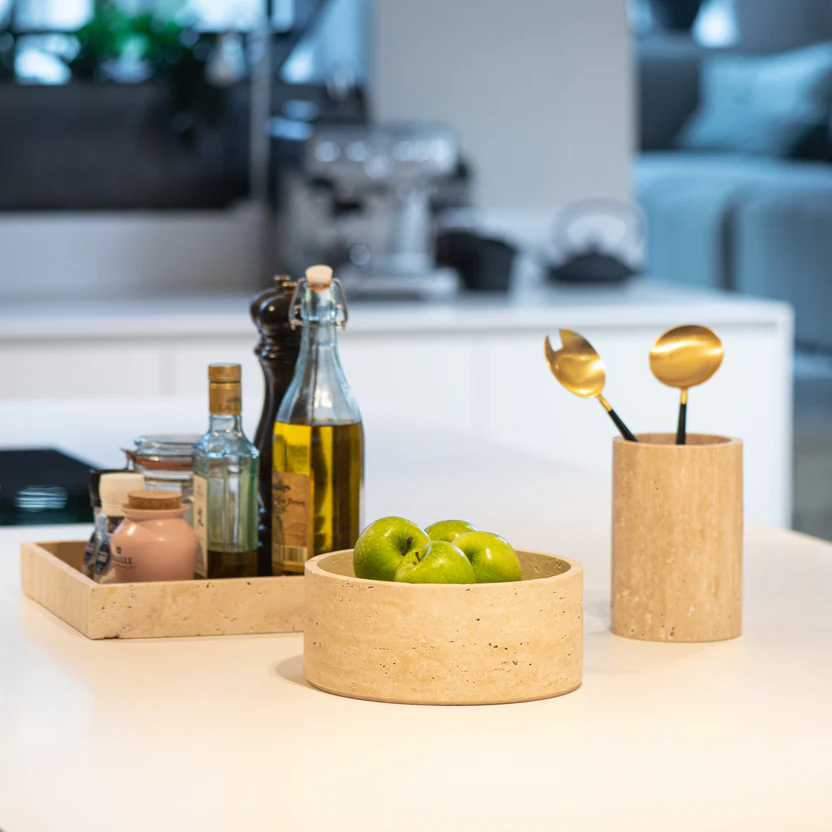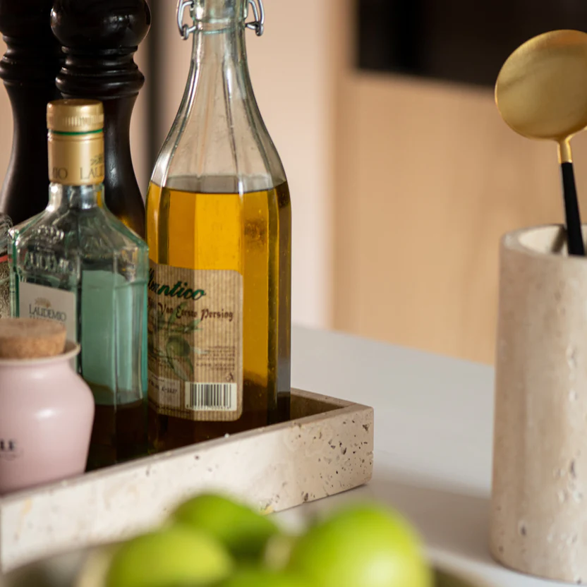 Enhance your home with the sleek and refined design of our travertine tray, a piece that effortlessly combines style and function. In the bathroom, it makes the perfect base for your beauty products or perfumes. In the kitchen, it organises your cooking essentials with grace, whilst in the living room it serves as a beautiful display for candles, radiating warmth and elegance.