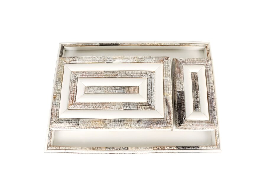 Luxury tray 'Wave' from RAF deluxe is beautiful as a decorative item on a side table. Handcrafted from horn in 2 operations, smooth and ribbed horn to create this elegant and uniquely designed tray. Stylish and at the same time practical to use. Each item is unique! Felt pads are placed under the tray to protect the surface. Matching storage boxes available in 2 sizes.
