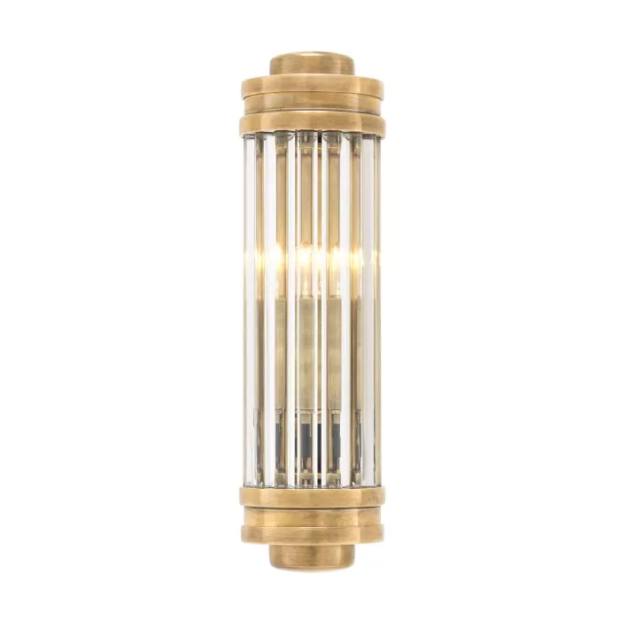 Bathe your interior in a soft and warm glow with the vintage brass finished Gascogne XS Wall Lamp, featuring a shade of ribbed and bevelled clear glass. Inspired by Art Deco theater lamps, this alluring sconce will add cosmopolitan style and glamour to your home décor.